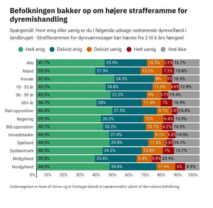 Hammeren skal falde langt hårdere, hvis man overtræder dyrevelfærdsloven. Helt konkret bakker et markant flertal af danskerne op om, at strafferammen skal lyde på seks år fremfor de nuværende to, hvis man udsætter dyr for vanrøgt. Det viser en meningsmåling, som Verian har foretaget for Dyrenes Beskyttelse.