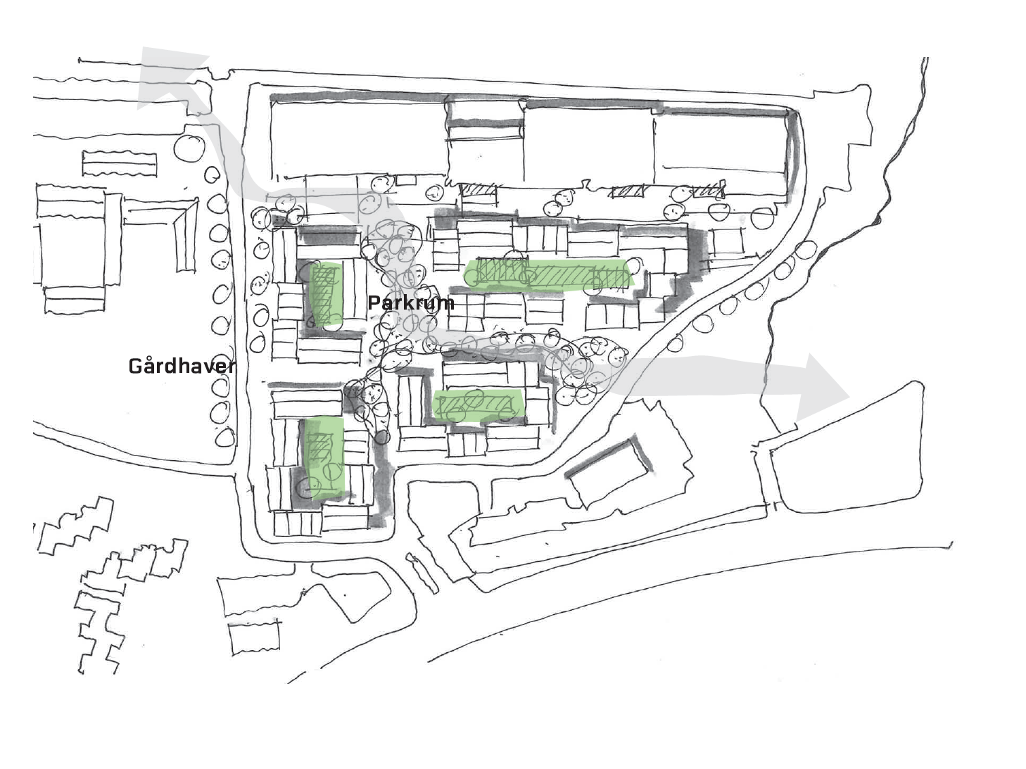 Projektet organiseres i fire boligkarréer samlet omkring et grønt, trafikfrit område. Langs motorvejen opføres en afskærmende bygning med butikker og parkeringshus, som samtidig beskytter boligerne mod trafikstøj. Den samlede bebyggelse vil have en gennemsnitshøjde på 4-6 etager og suppleres af en enkelt høj bygning som pejlemærke i området.