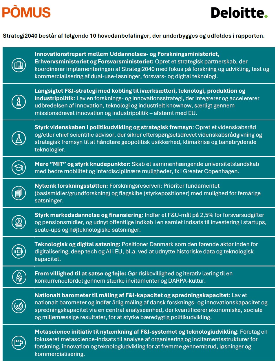 Rapporten sammenfatter sine anbefalinger i en 2040-strategi, der er baseret på en omfattende analyse af, hvordan forskning og innovation kan sikre og udvikle Danmarks konkurrenceevne, velstand og sikkerhed i en ny, teknologidrevet verdensorden.