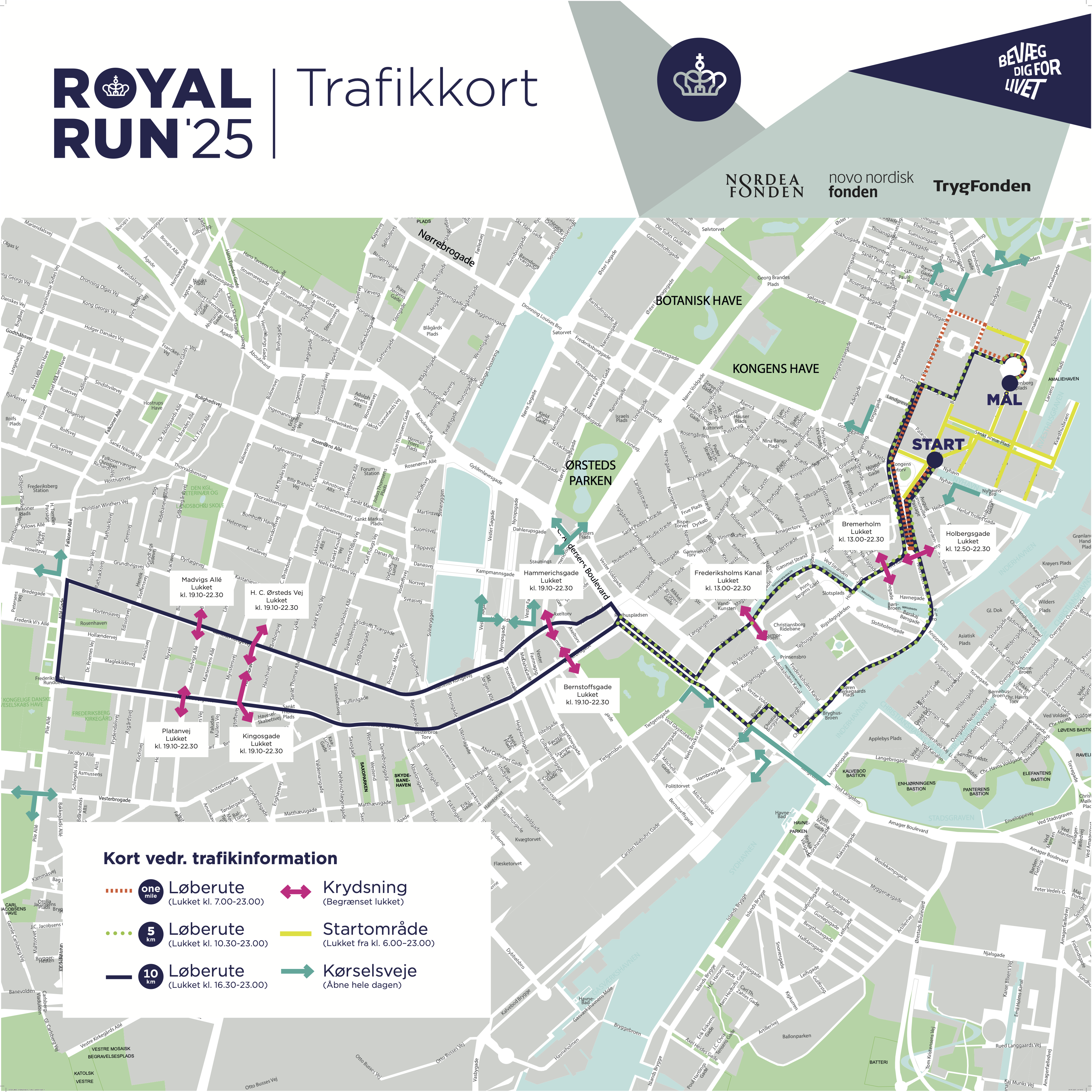 Se info om krydsningspunkter og kørselsveje på kortet eller under 'Trafikinfo' på linket her: https://royalrun.dk/vaertsbyer/kbhfrb/