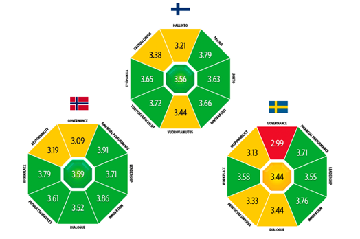 While most dimensions for the defence industry fall within the good range (above 3.50), the lowest scores were recorded in the Governance category. In Finland, the rating was 3.21 and in Norway, 3.09 – both considered fair – while Sweden scored 2.99, classified as poor.