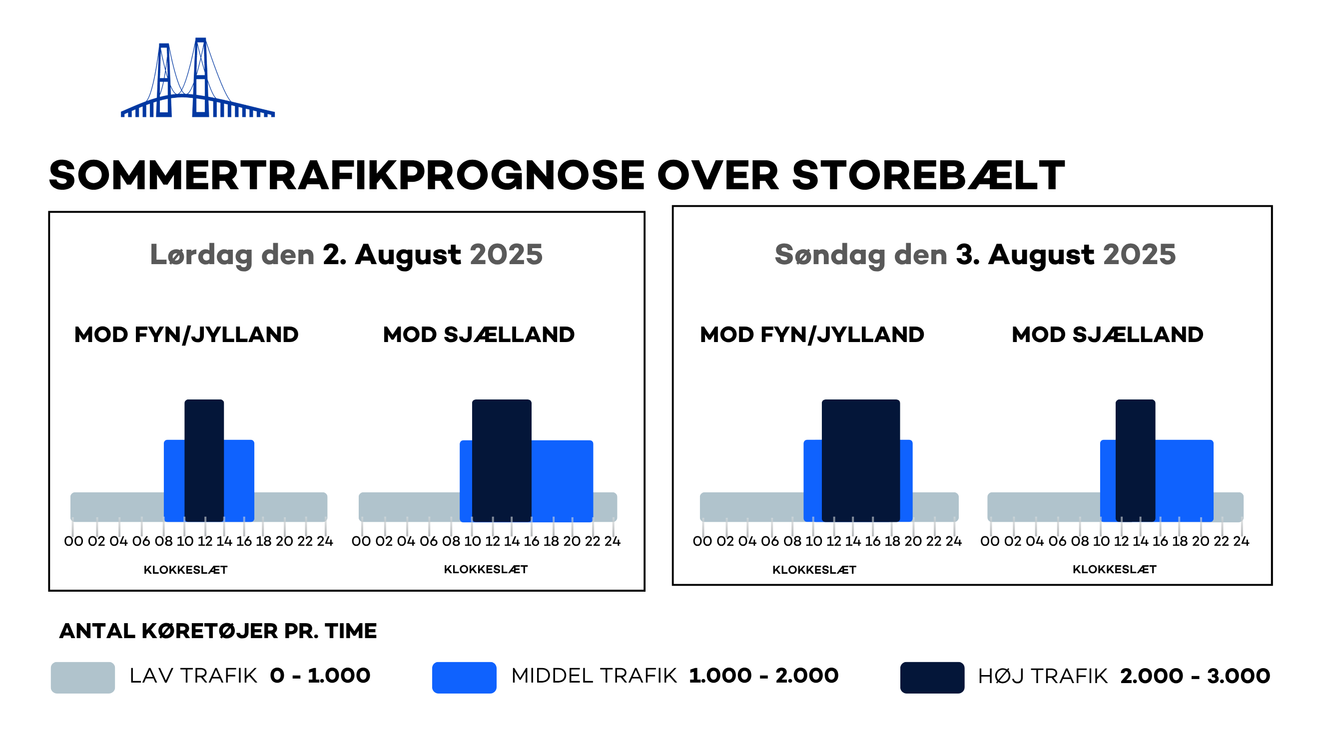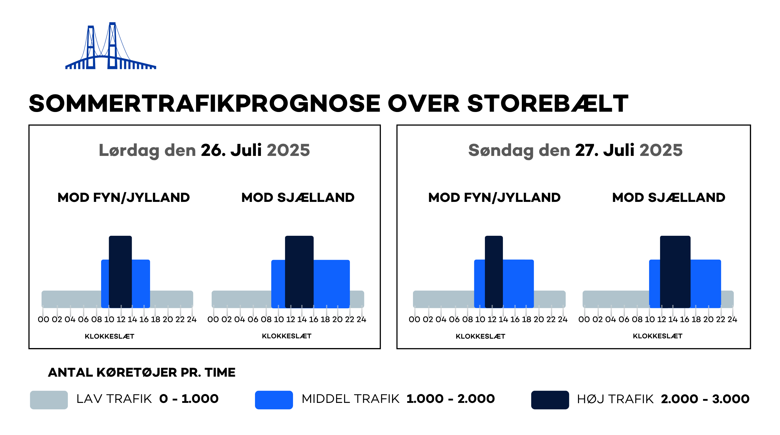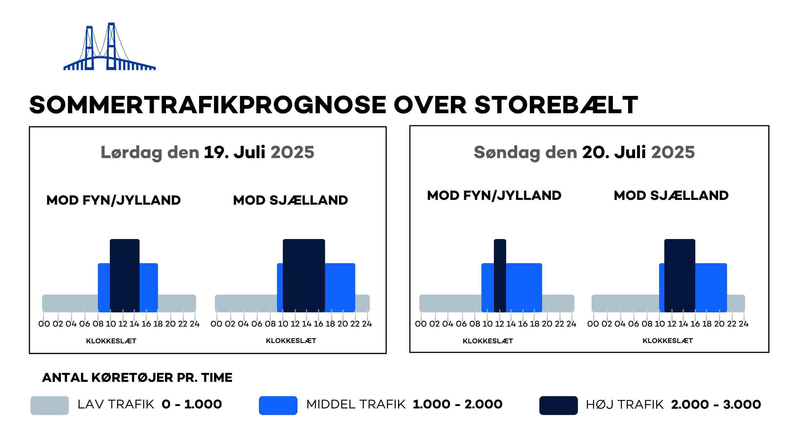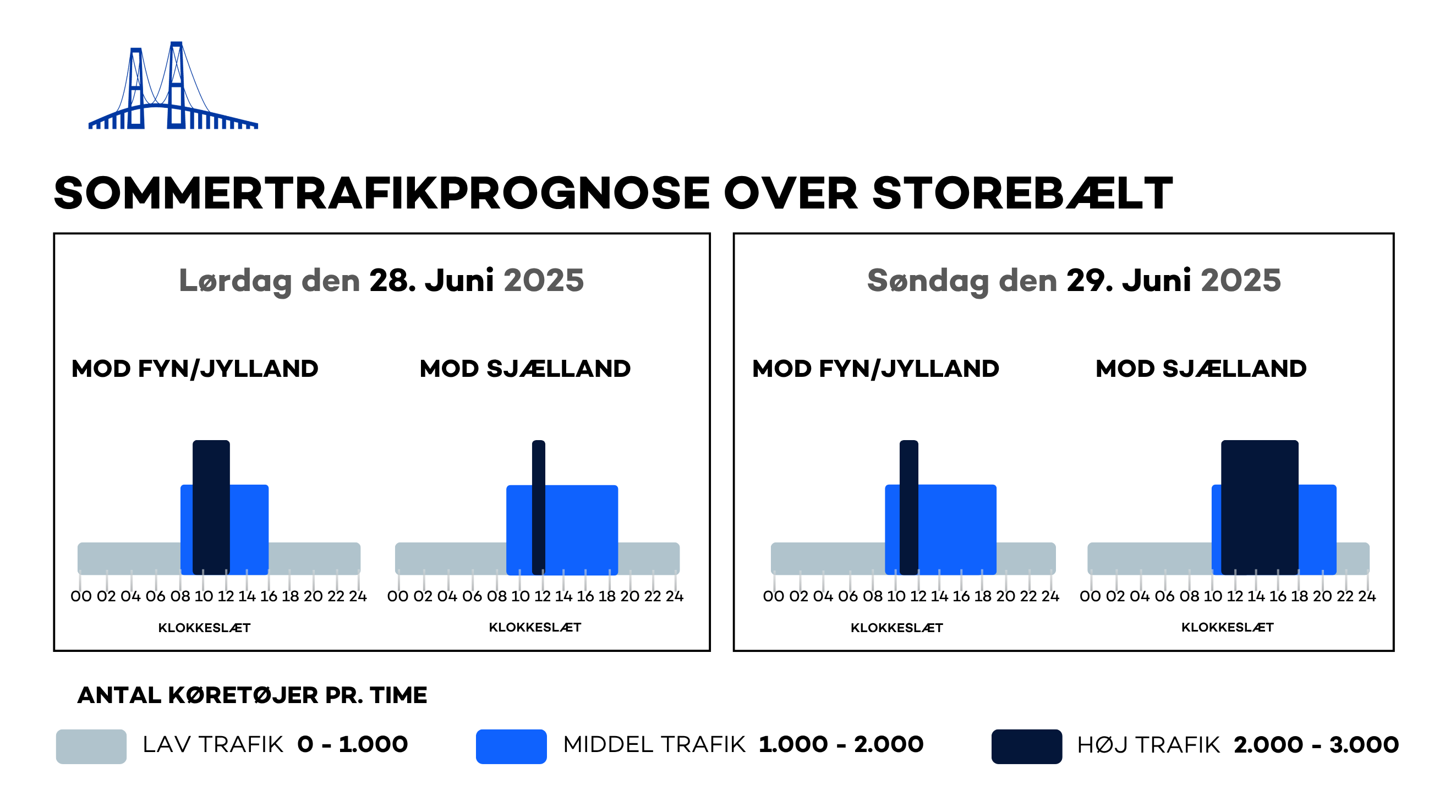 Generelt forudser Sund & Bælt øget trafik hen over sommeren, og omkring weekender vil der opstå perioder med tæt trafik og længere rejsetid. De travleste perioder i retning mod Fyn og Jylland vil være på lørdage og søndage mellem kl. 10:00 og kl. 14:00. I retning mod Sjælland er trafikken tættest lørdage og søndage mellem kl. 11:00 og kl. 17:00.