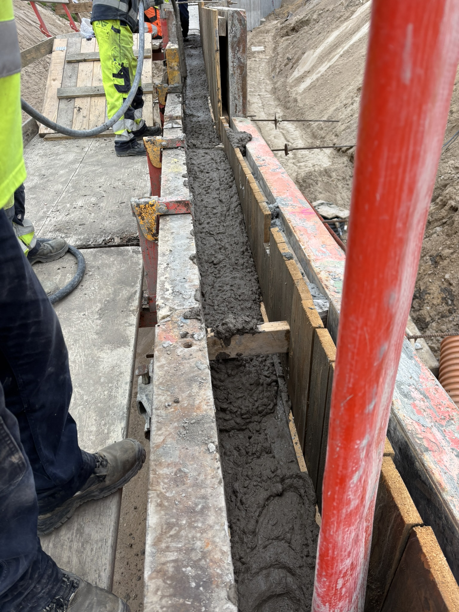Demonstrationsprojektet i Aarhus giver mulighed for at teste den nye betonteknologi i praksis. Her er der blevet støbt cirka 70 kubikmeter beton med forsøgscementen til støttemuren.