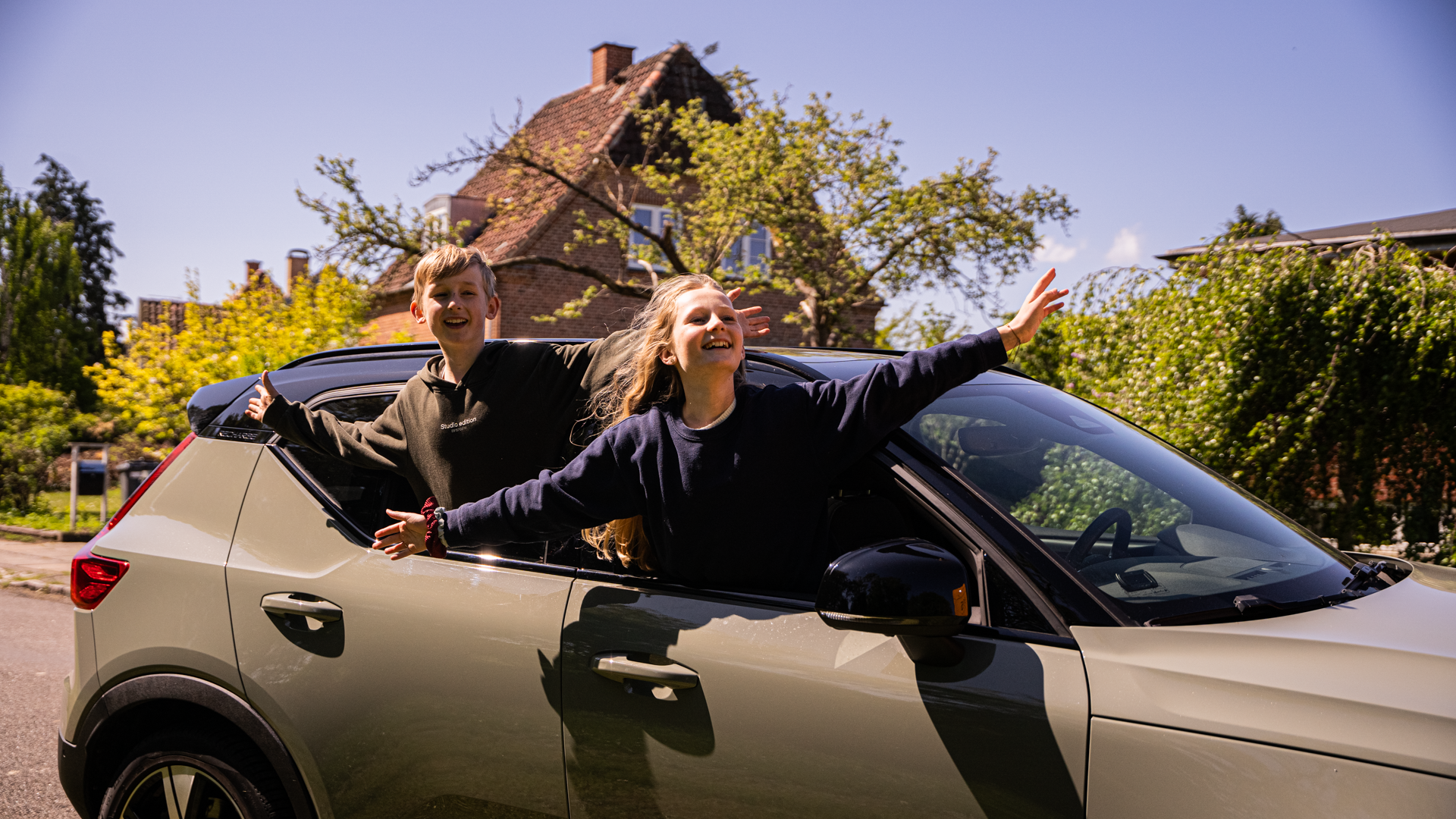 To børn kigger ud af bilvinduerne, mens de smiler og strækker armene ud.