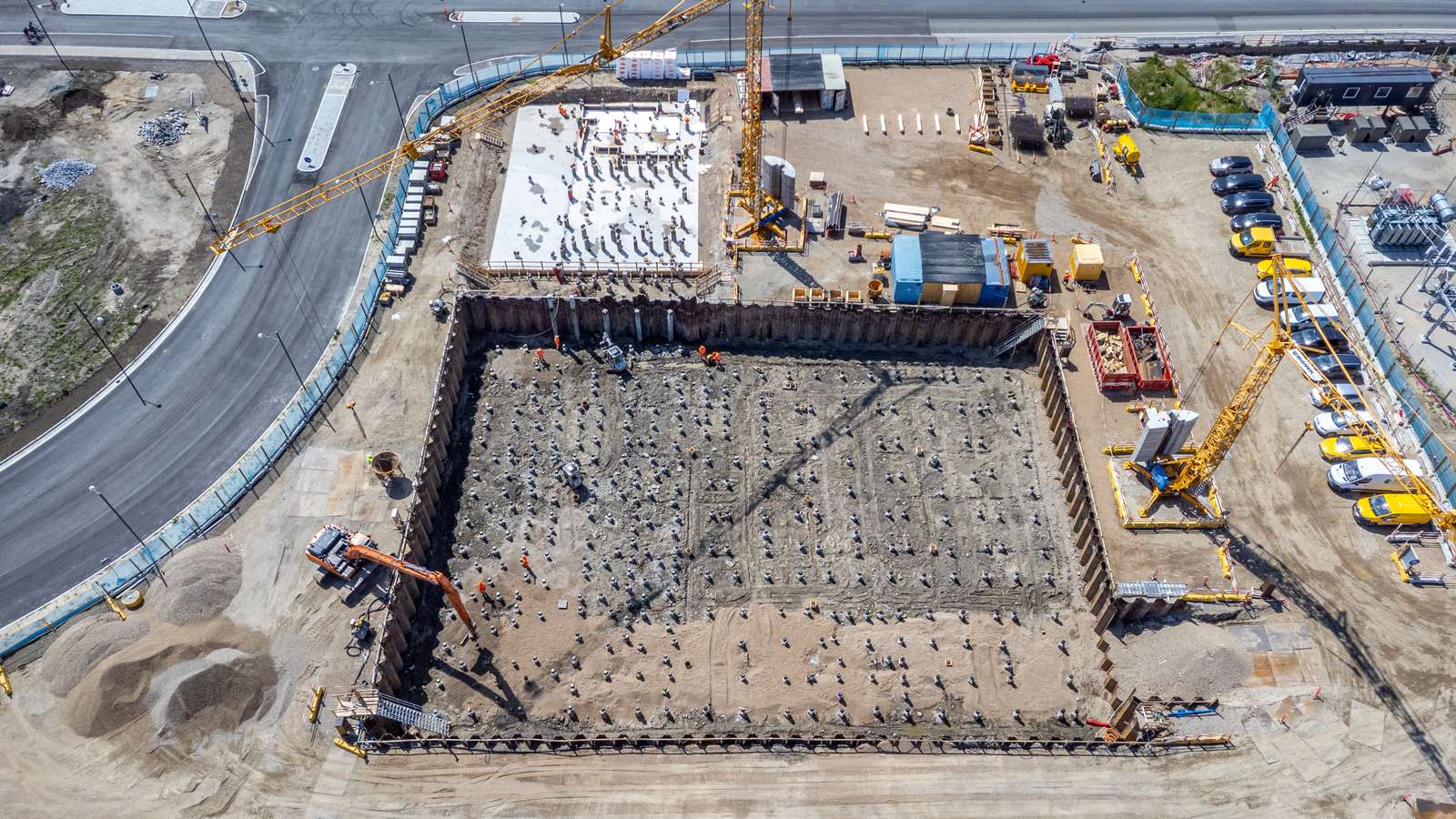 Med jord- og funderingsarbejdet på plads er fokus nu skiftet til betonarbejdet. Drænlaget under kælderen er etableret, snart skal renselaget støbes, og derefter kommer turen til de tre meter høje kældervægge, der bliver støbt in-situ ligesom dækket over den kommende kælder.
