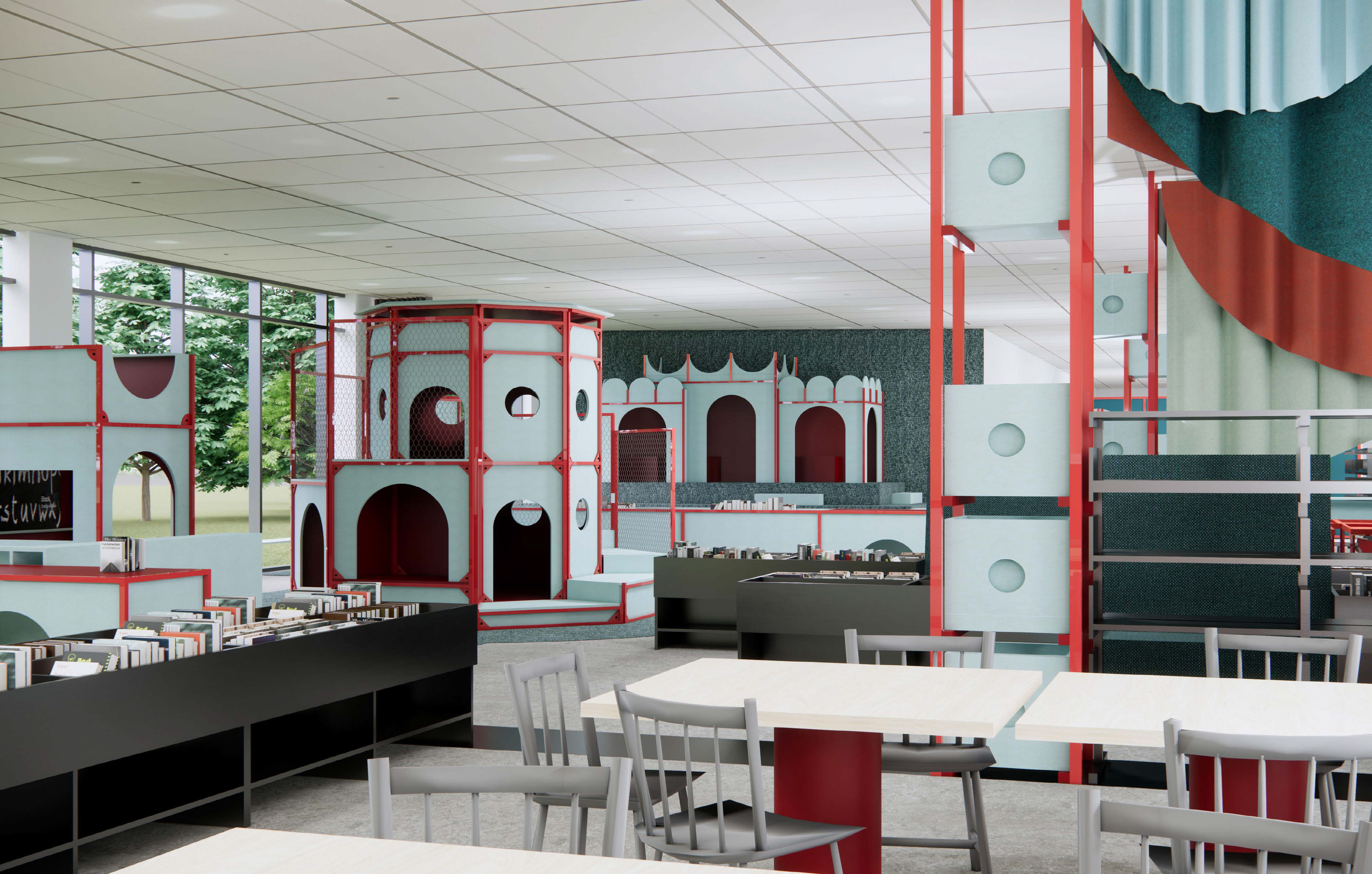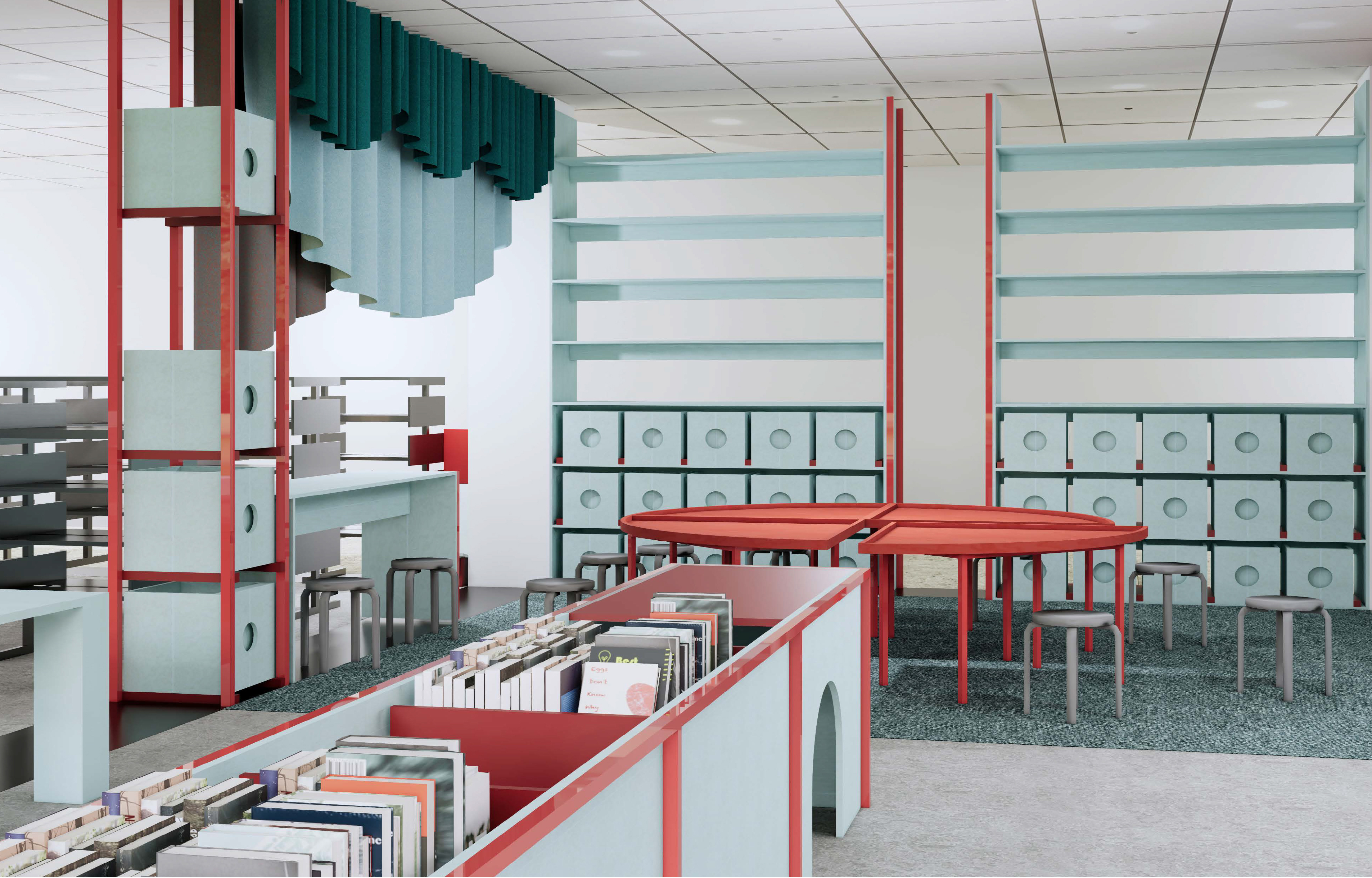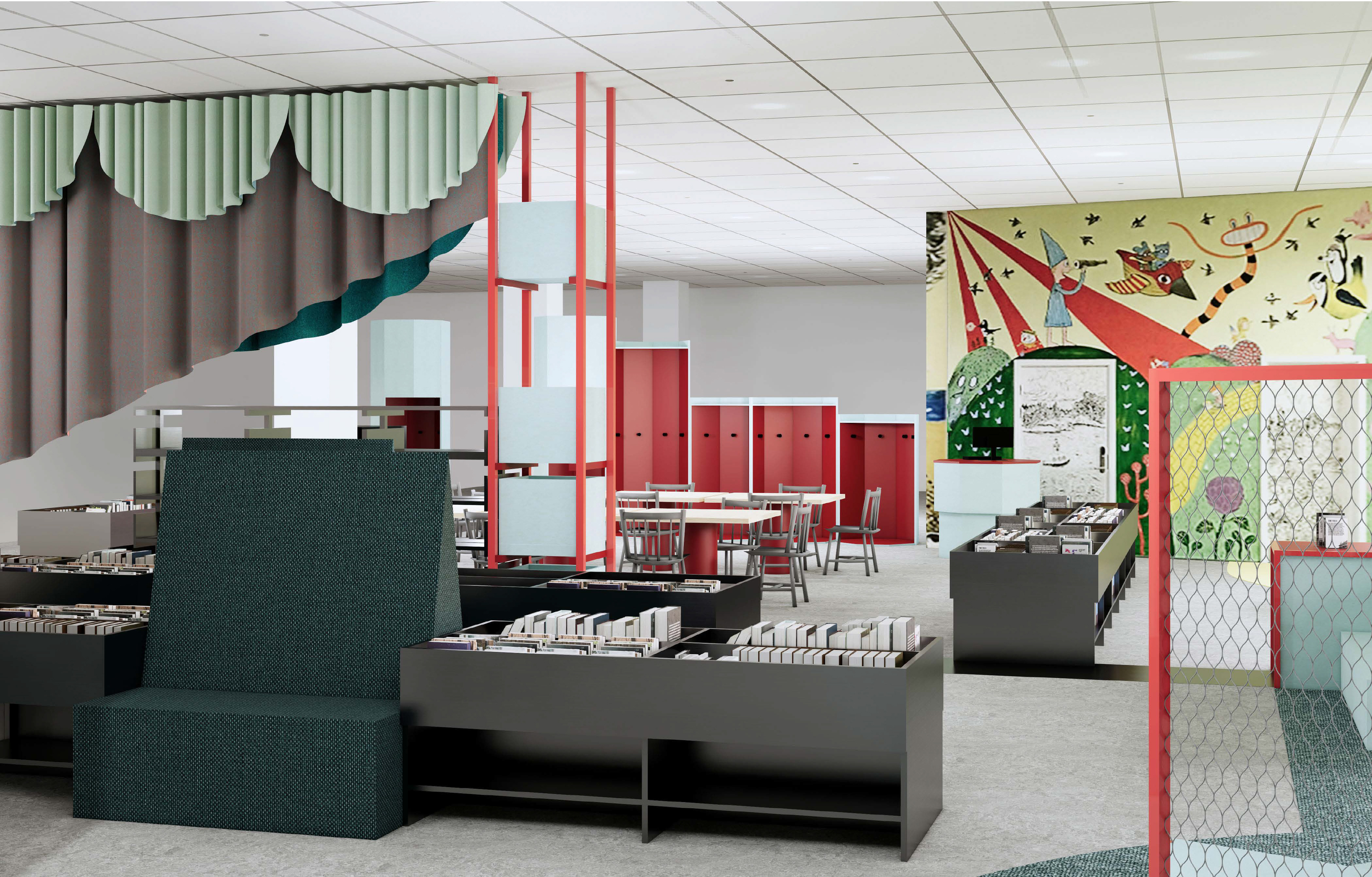 - Alle arkitektoniske elementer er skræddersyet til Næstved børnebibliotek ud fra samtaler med brugere, bibliotekarer og børn. Børnene har været med til at beskrive og dermed skabe de zoner, der snart bliver bygget.