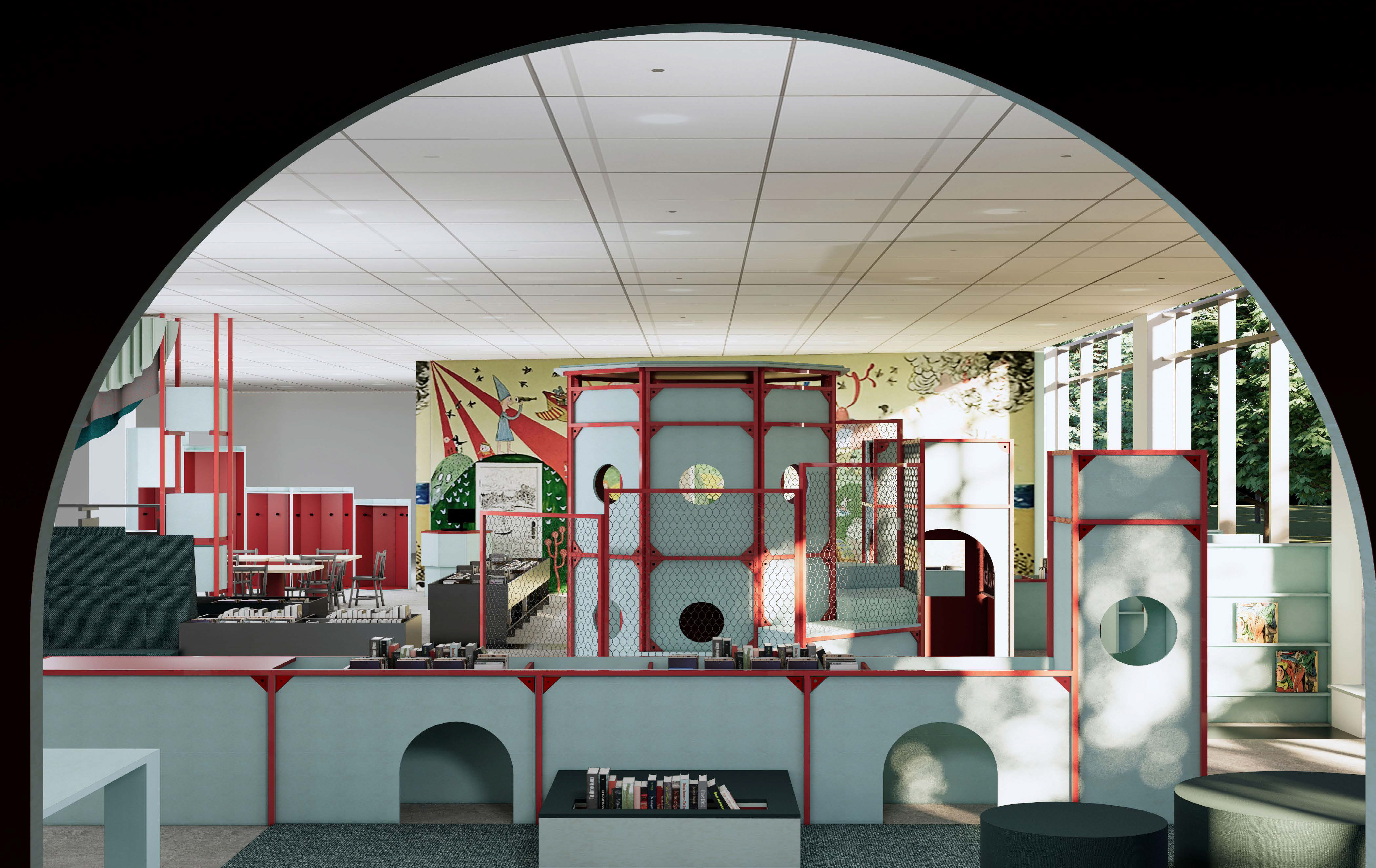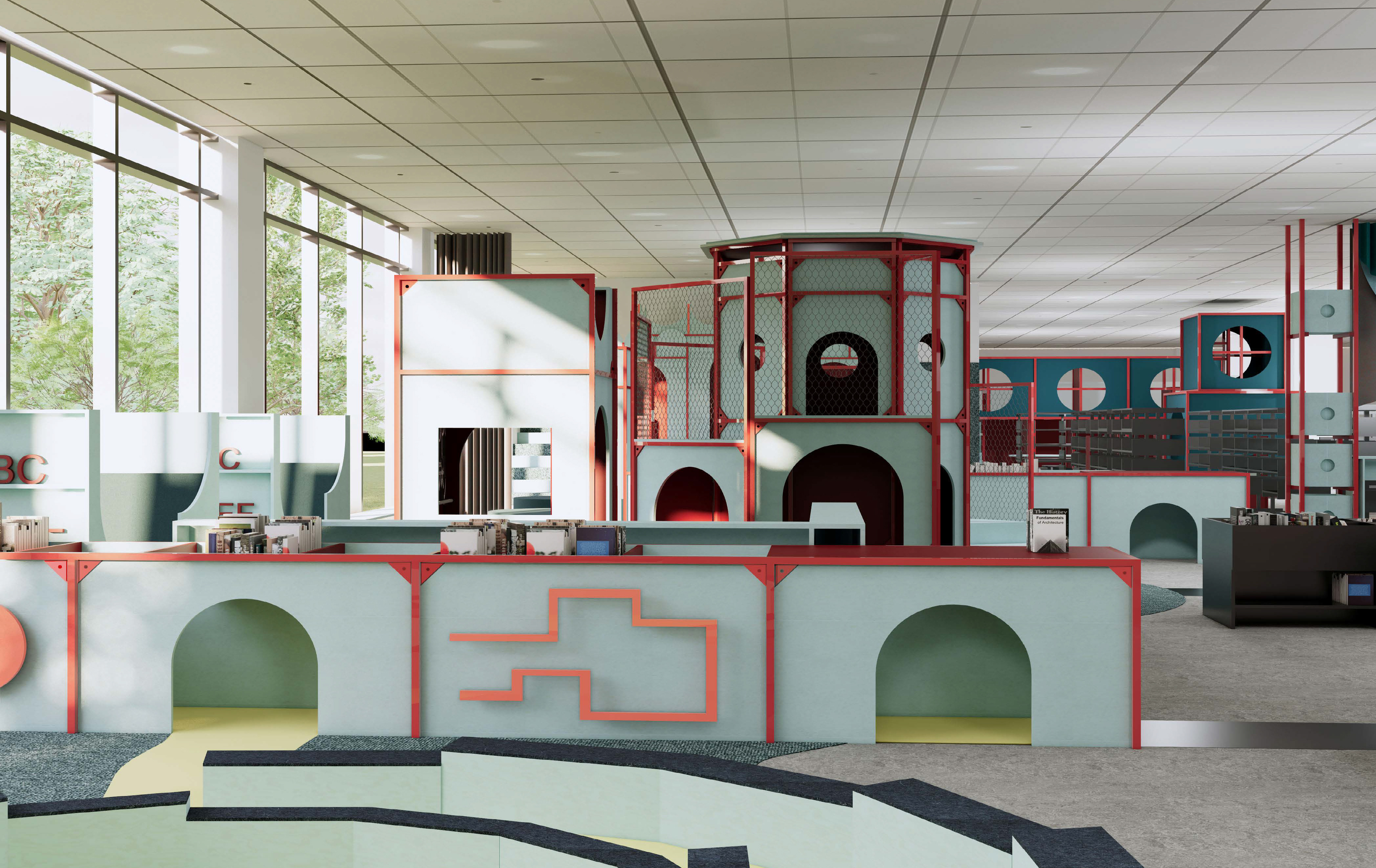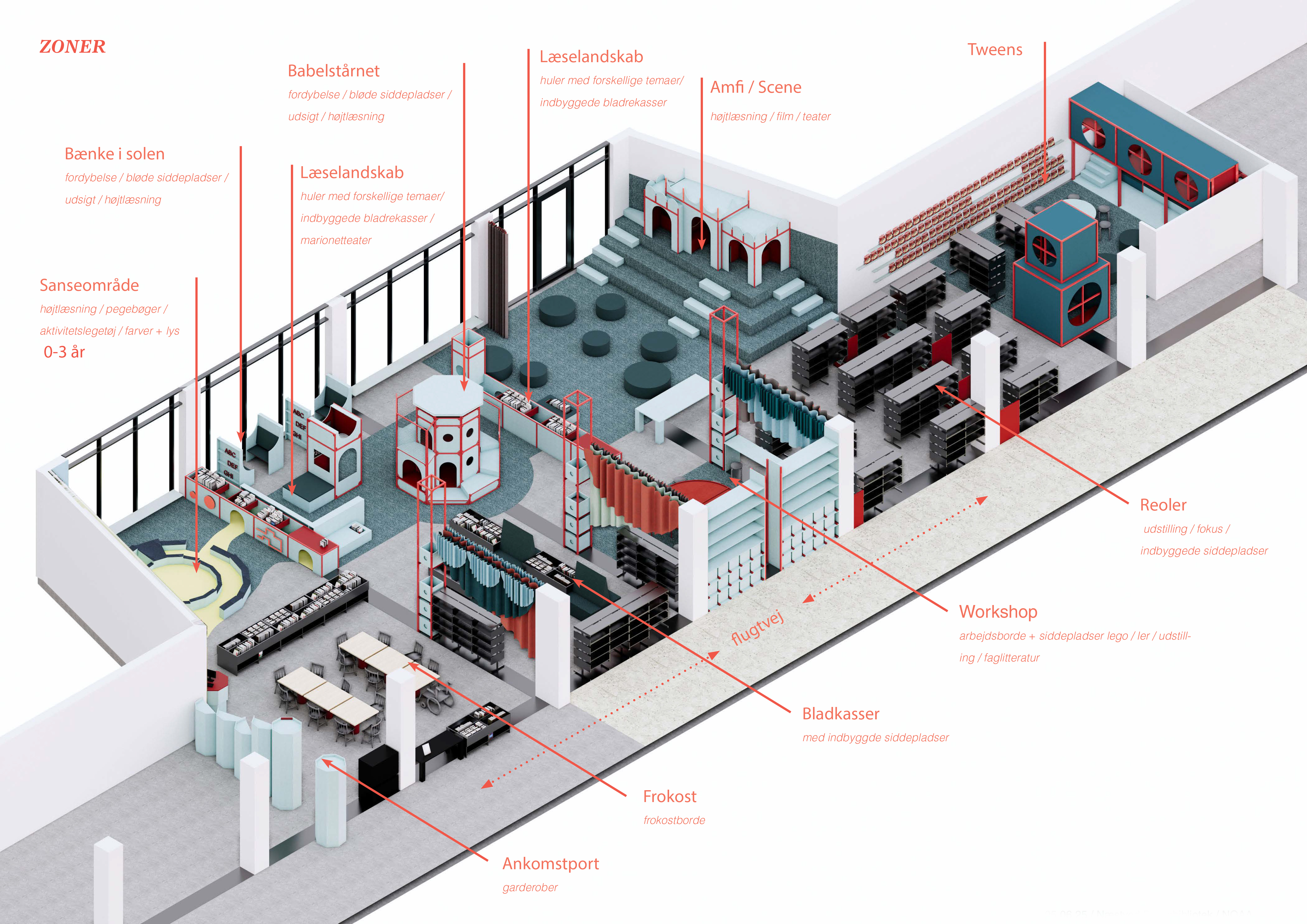 De 0-3-årige får et nyt sanseområde, mens de 9-12-årige får et særligt tween-område designet i tæt samarbejde med børnene selv. Der er forskellige zoner for de 4-8-årige. Et babelstårn, en amfi-trappe, scene og dukketeater skaber for eksempel rum til leg og fantasi. Hyggelige læsehuler inviterer til fordybelse og rolige læsestunder. Der er også plads til kreativitet i det nye workshop-område – og så er der selvfølgelig madpakkeborde, når sulten melder sig.