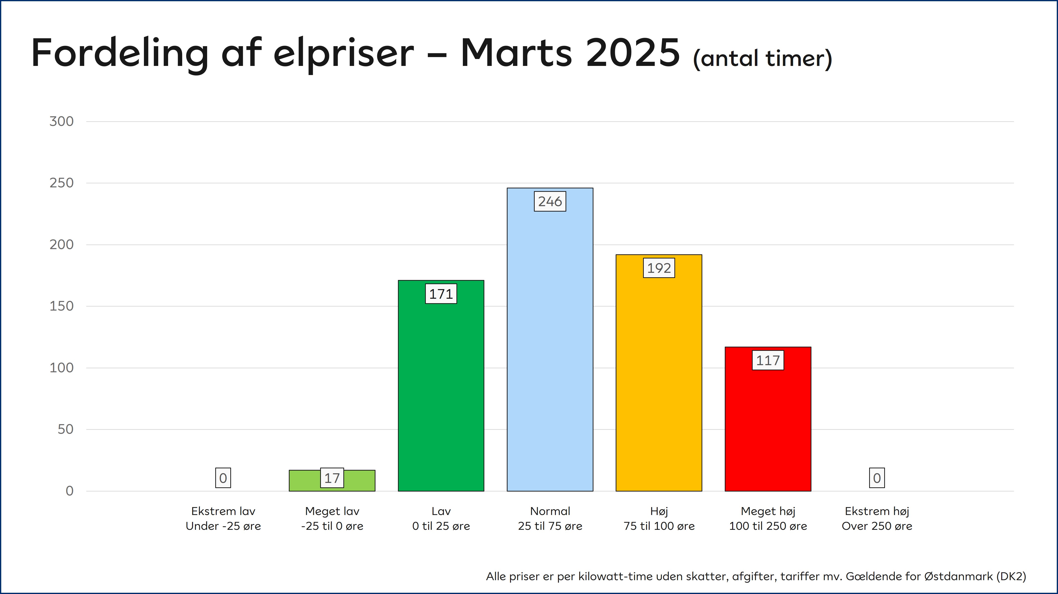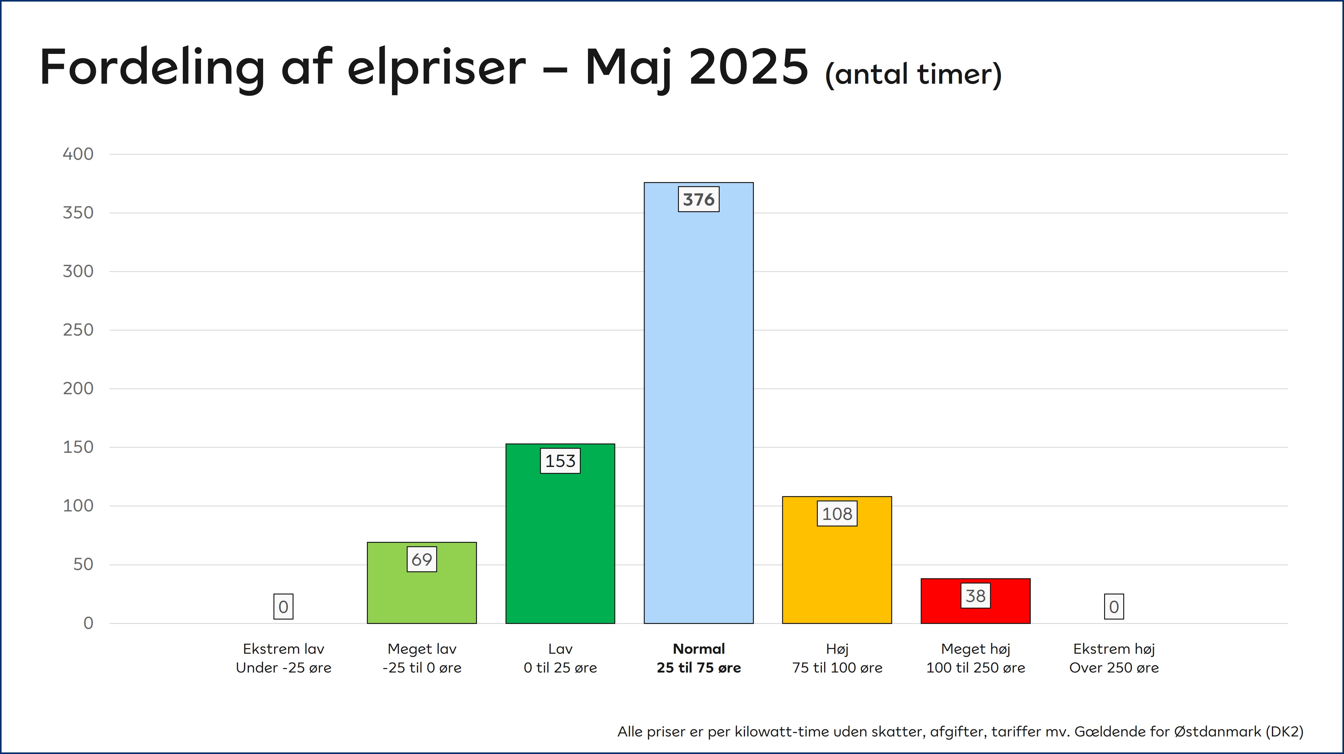 Månedens laveste elpris ramte 21. juni, hvor den rå elpris kl. 14 nåede ned i minus 18,91 øre per kilowatt-time. Prisen toppede i går d. 30 juni kl. 20 med en pris på ca. 215 øre. For slutkunder svarer det cirka til henholdsvis 1,16 kroner og 4,38 kroner per kilowatt-time inklusive alle skatter, afgifter mv.