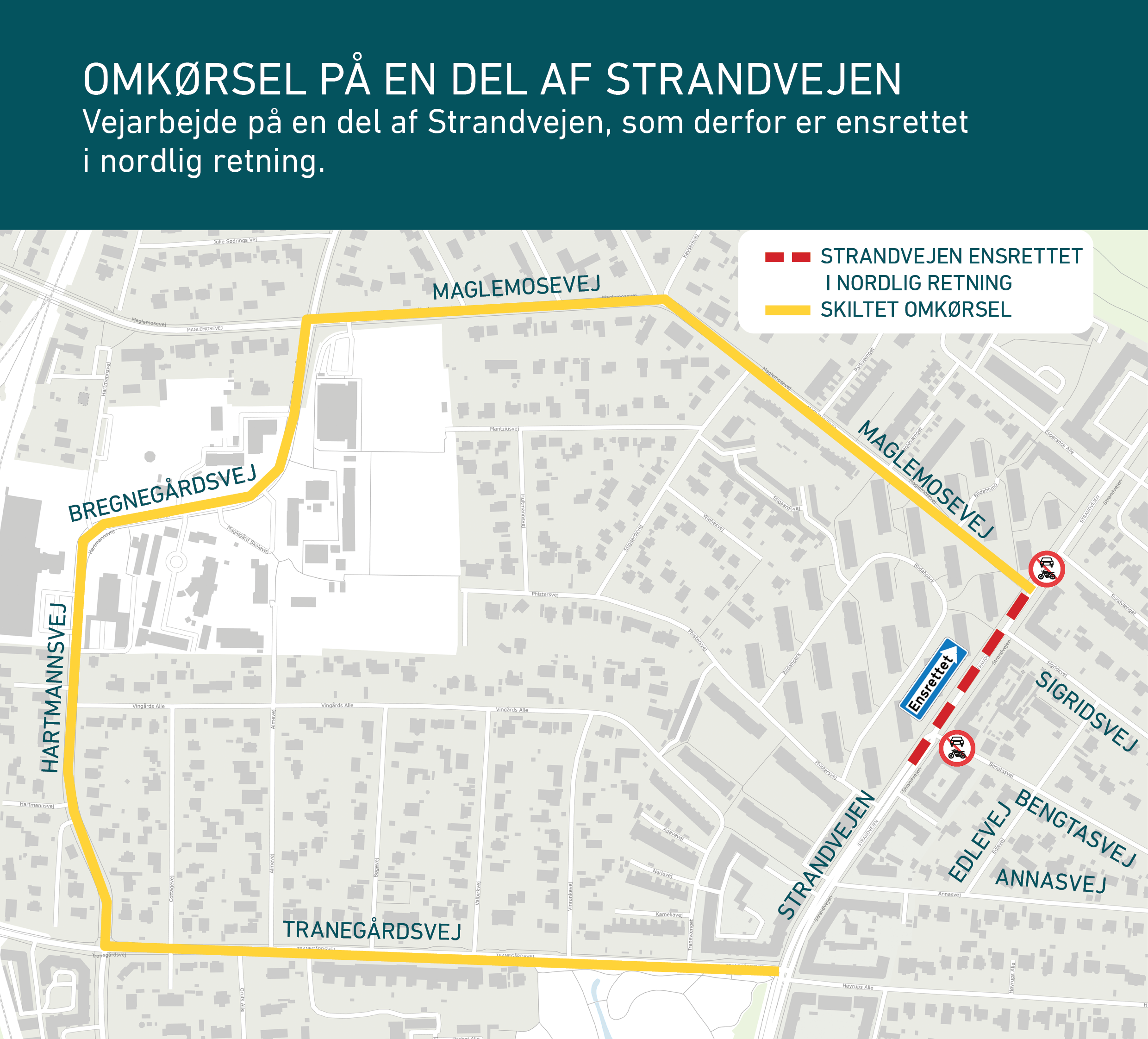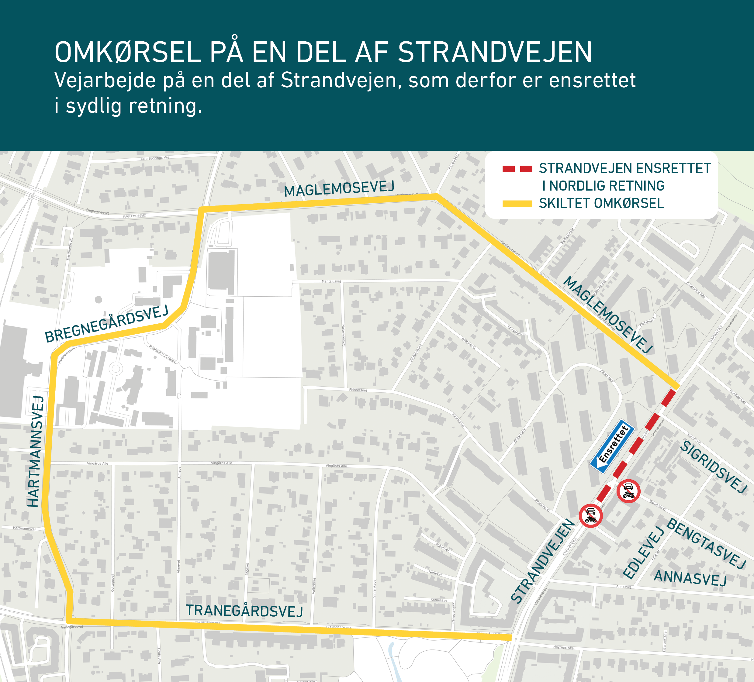 Fra mandag 14. juli og frem til mandag 28. juli bliver trafikken ensrettet i nordlig retning, dvs. at du kan køre på Strandvejen, når du skal ud af København. Omkørselsruten er via Maglemosevej, Bregnegårdsvej og Tranegårdsvej.