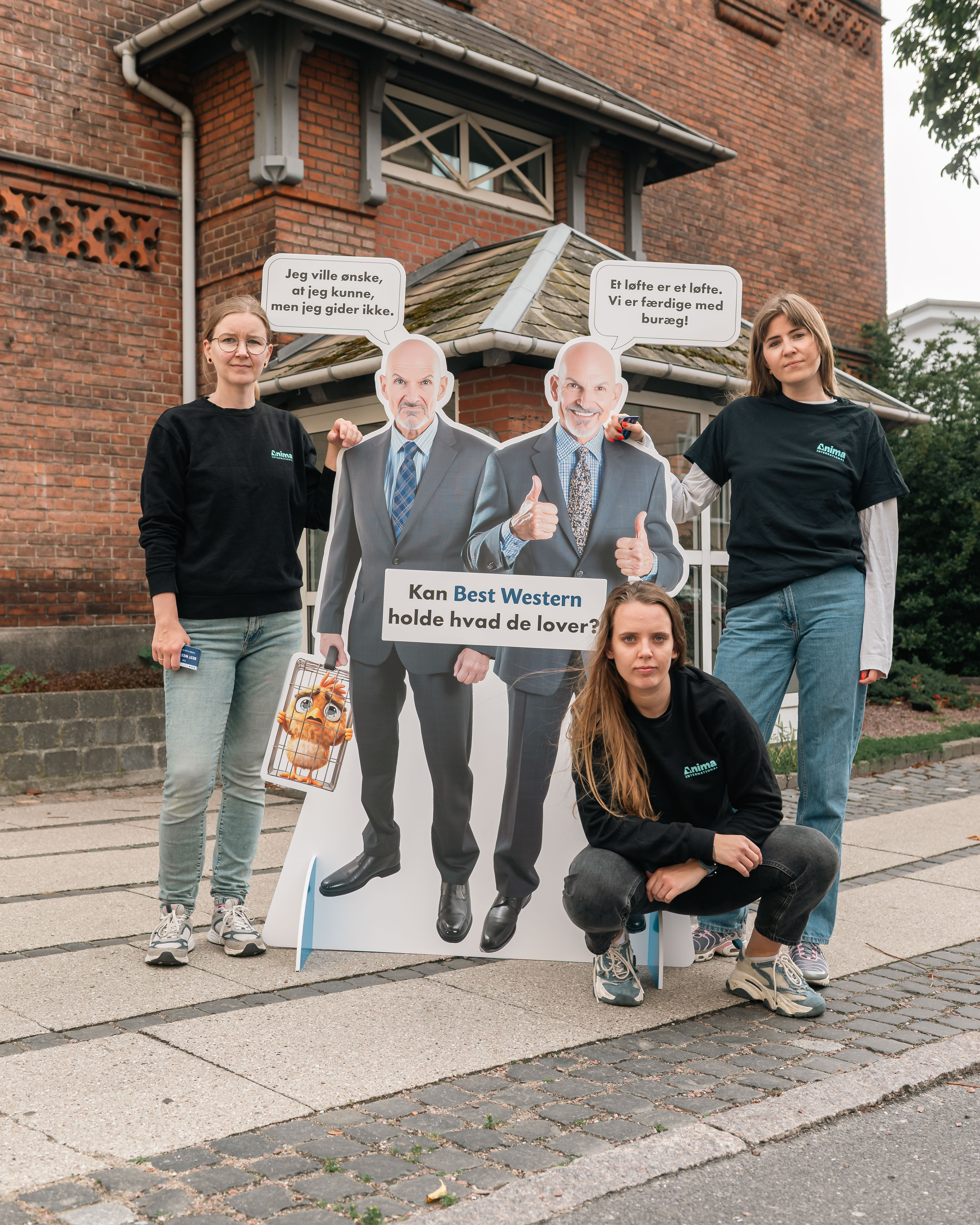 Best Westerns globale ledelse gav i 2019 et klokkeklart løfte om at udfase buræg på alle deres hoteller inden udgangen af 2025. Seks år senere ved vi stadig meget lidt om hvor langt Best Western er med at blive fri for buræg. Derfor gennemførte Anima i fredags en aktion foran det danske hovedkontor for at få den lokale afdeling til at lægge pres på den globale ledelse.