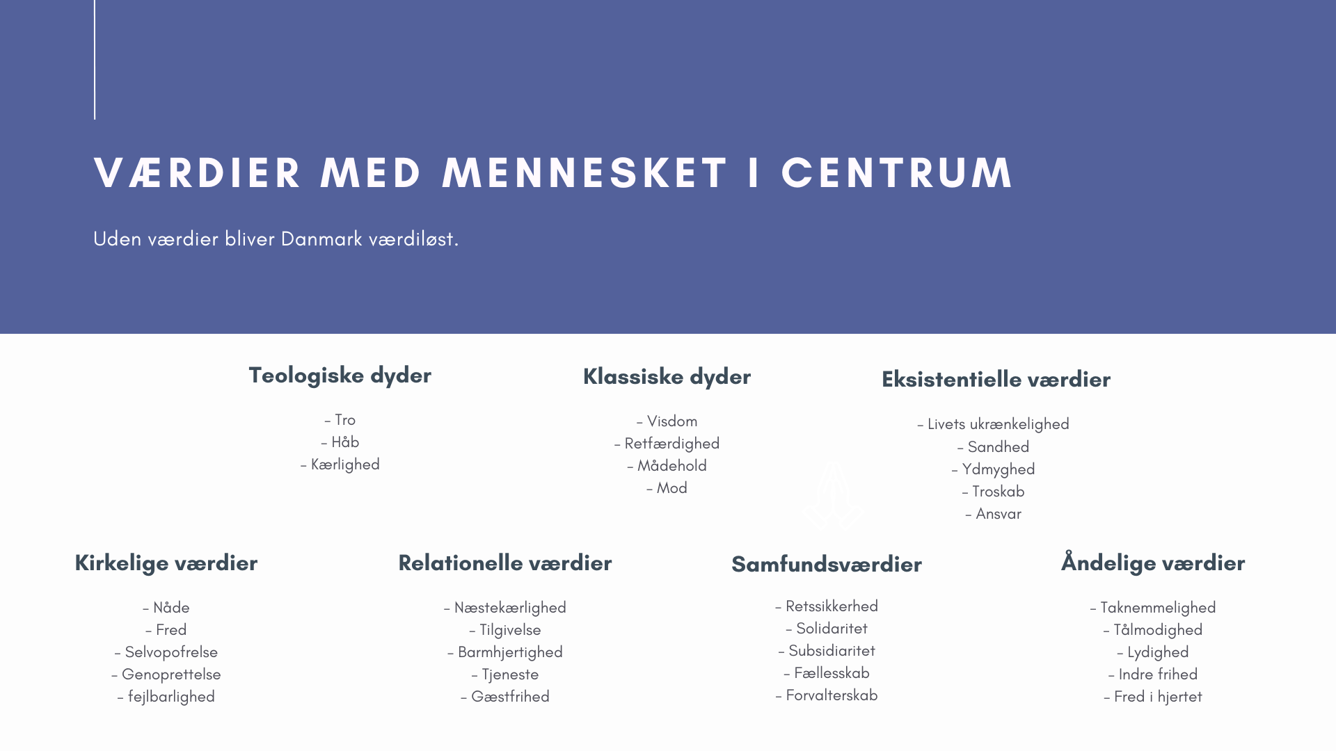 KristenDemokraterne fremlægger bud et værdigrundlag for Danmark, der består af 32 nøgleværdier, opdelt i syv kategorier – fra teologiske og klassiske dyder til relationelle og samfundsmæssige værdier.