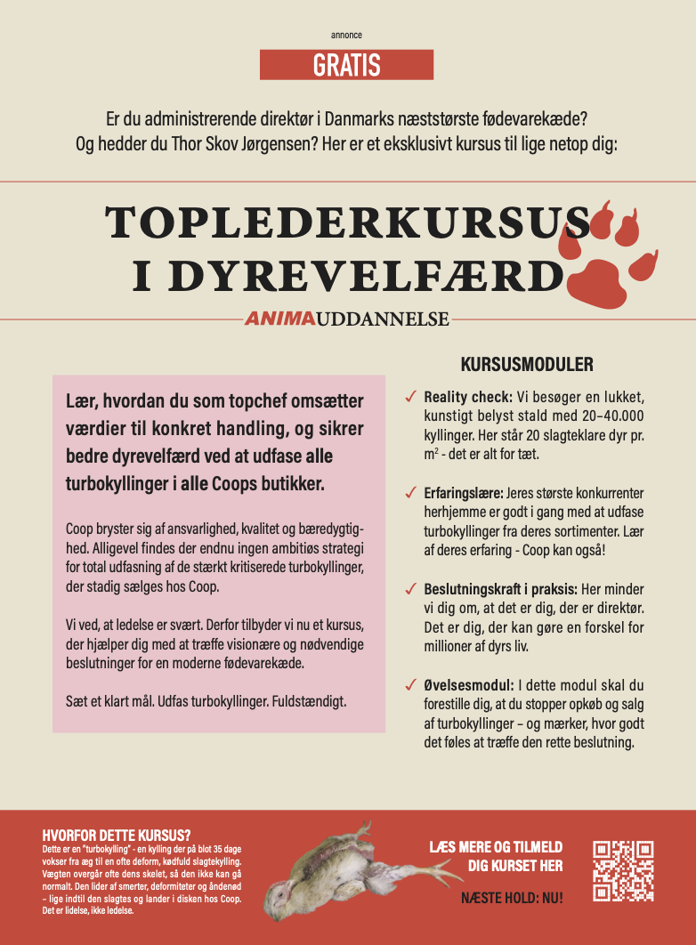 Dyreværnsorganisationen Anima skruer op for presset på Coops administrerende direktør, Thor Skov Jørgensen, i en ny kampagne. Med helsidesannoncer i landsdækkende medier inviteres direktøren på et gratis ”ledelseskursus i dyrevelfærd” – et lynkursus i turbokyllingers virkelighed og i, hvordan en ansvarlig leder tager de rigtige beslutninger og udfaser salget af alle turbokyllinger i Coop.