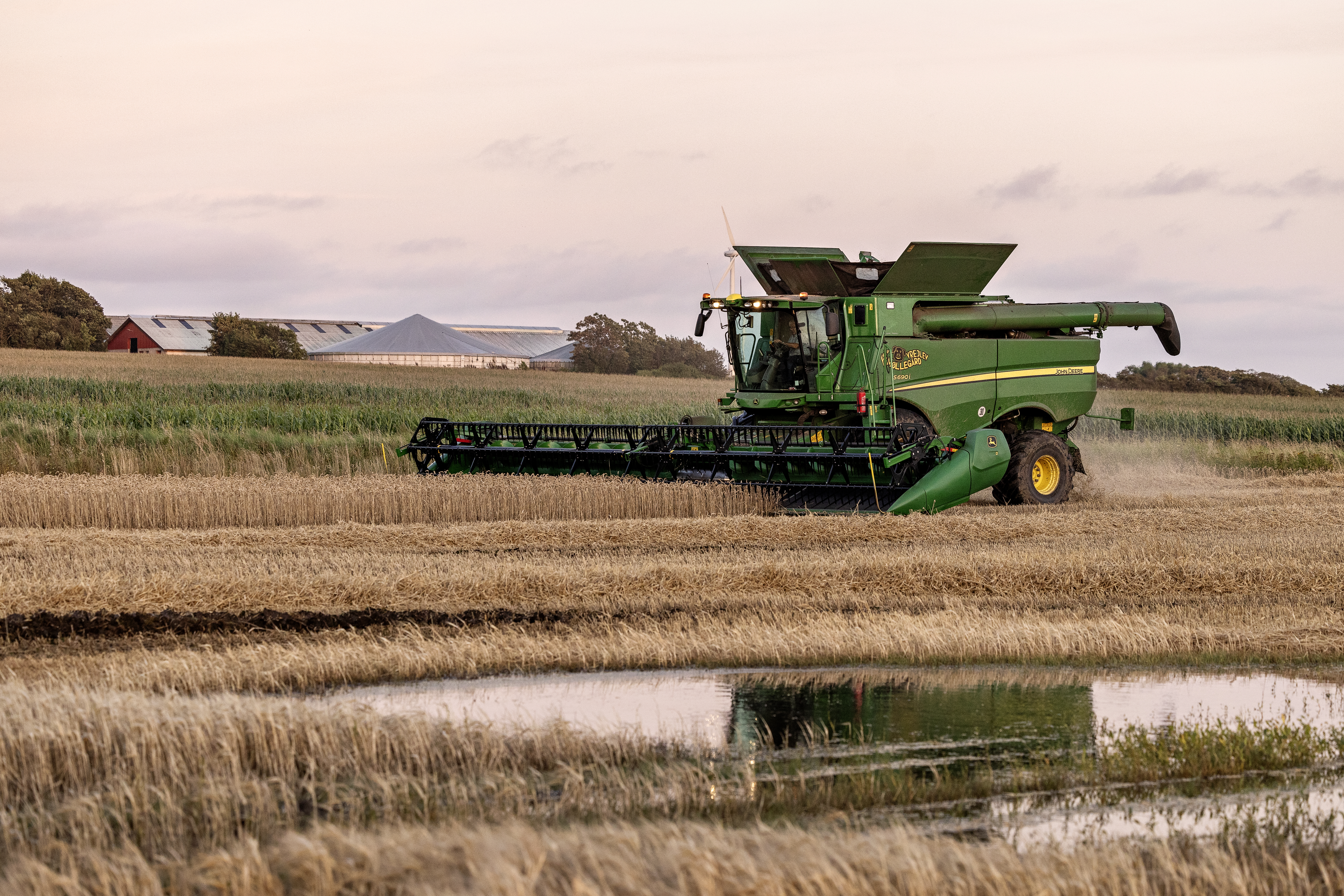 Det var i det østlige Danmark, hvor det voldsomme vejr ramte hårdest. Jo længere sydpå, desto mere vand faldt der. Overordnet står kornet dog flot, og der meldes om heftig aktivitet på markerne både mandag og tirsdag morgen.