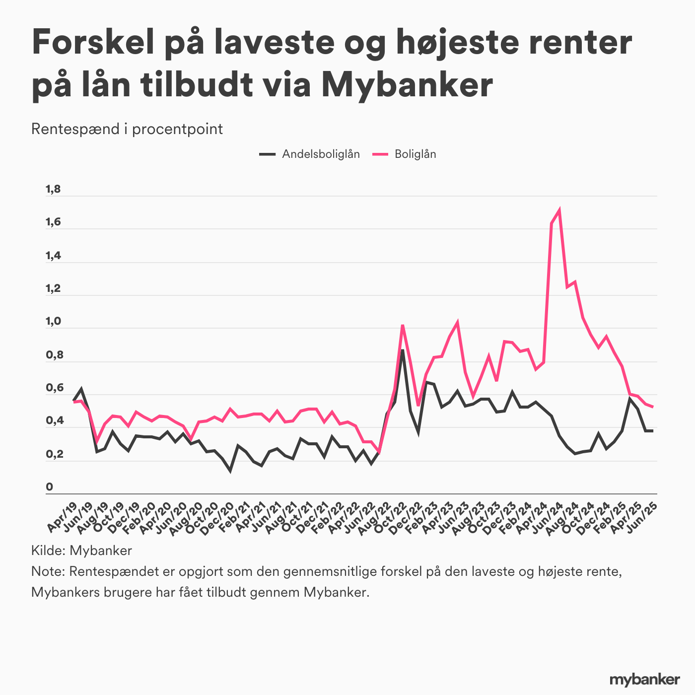 Den gennemsnitlige rente dækker over forskelle på de højeste og laveste renter på lån, som Mybankers brugere er blevet tilbudt af bankerne. I juli lød den gennemsnitlige forskel på 0,3 procentpoint for andelsboliglån og 0,4 procentpoint for boliglån.