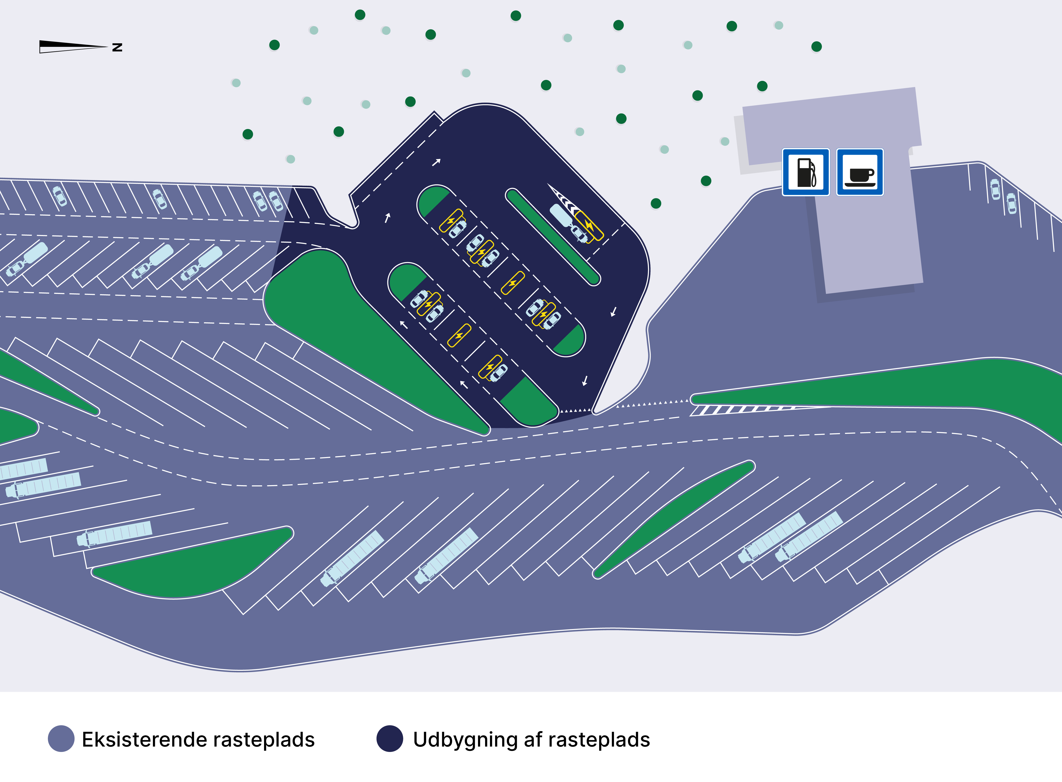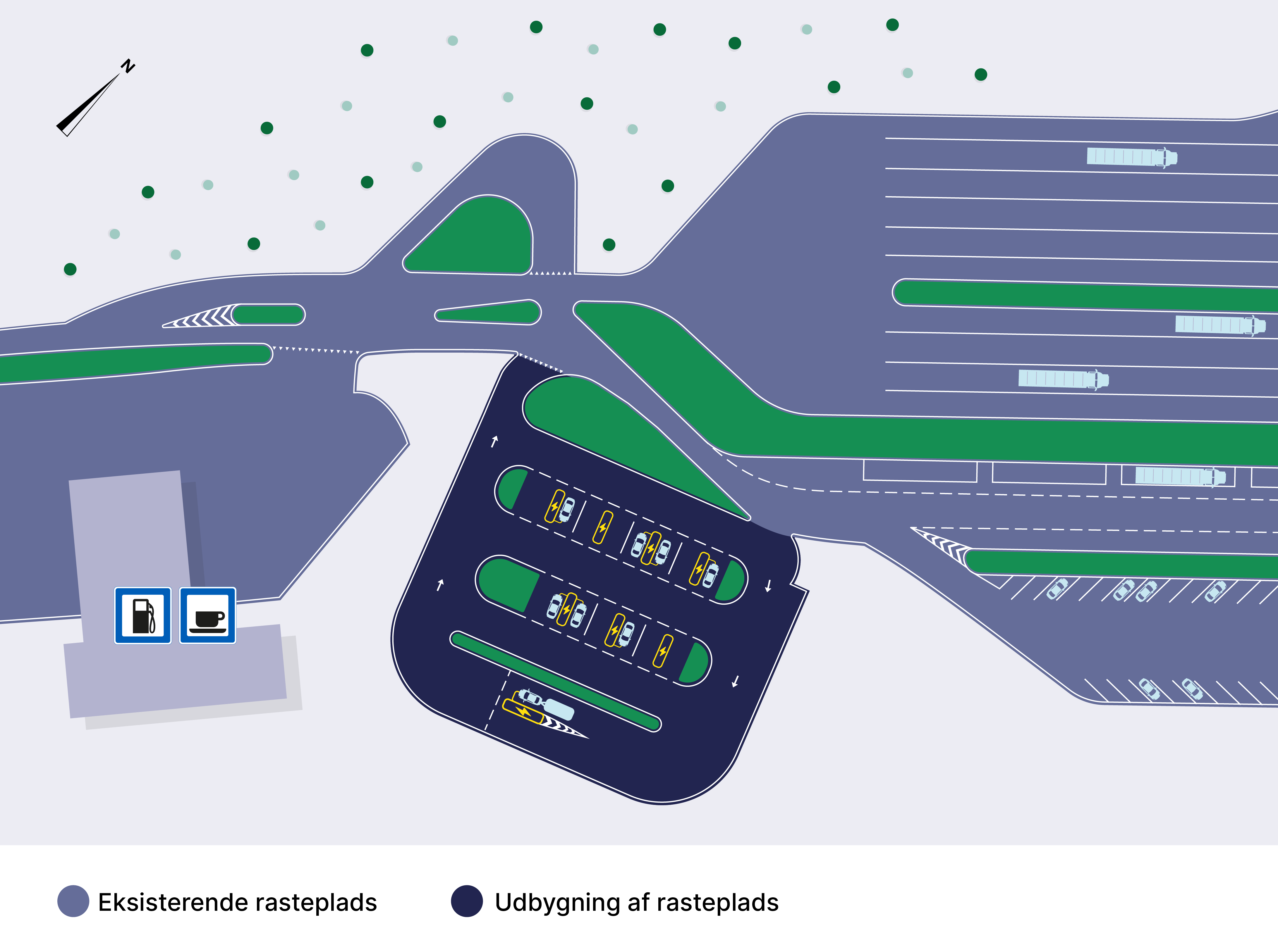 Ud over de to nye ladeparker ved Ustrup vil Vejdirektoratet i år også etablere ladeparker ved rastepladserne Frøslev nær Padborg på Sønderjyske Motorvej.