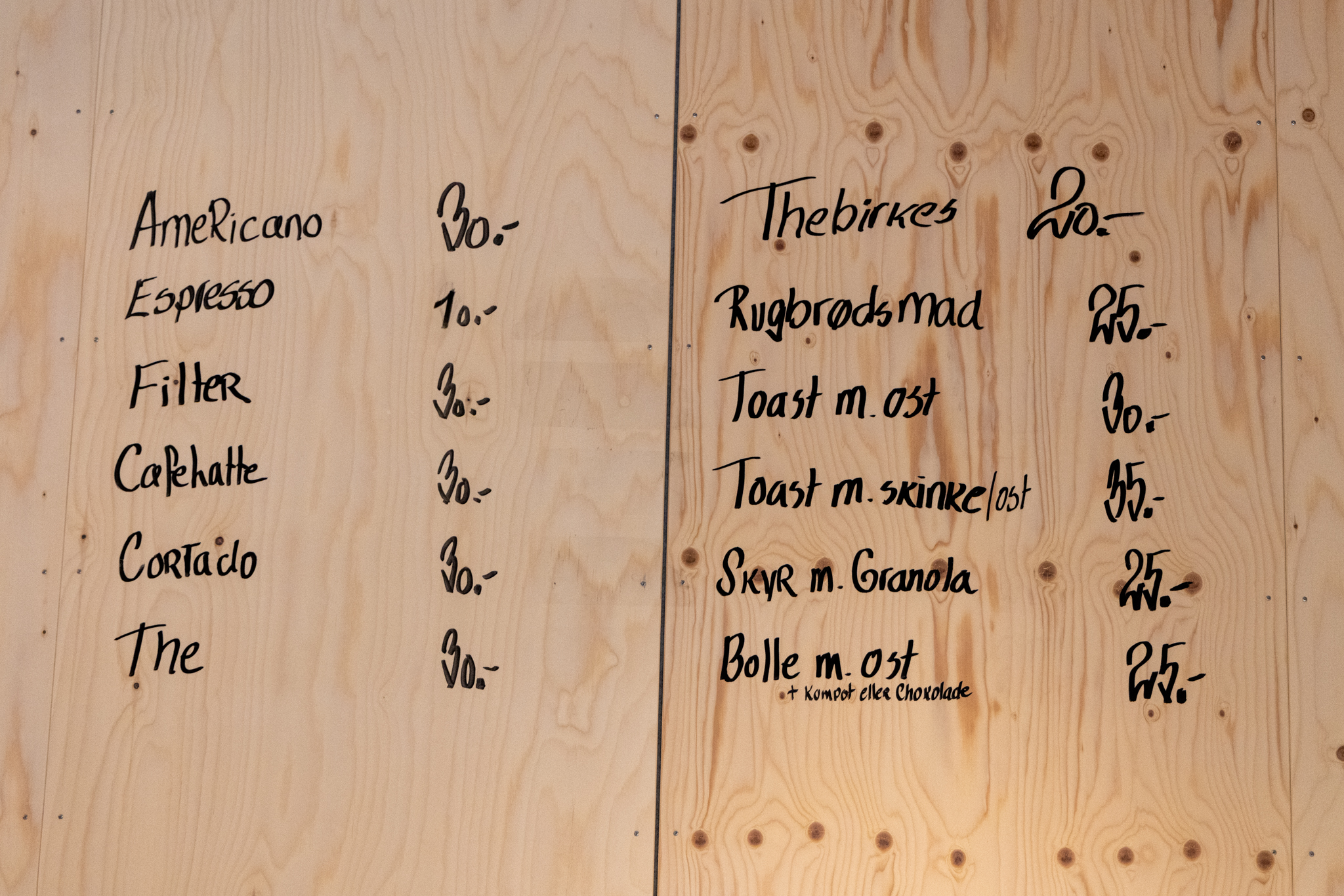 Caféerne byder blandt andet på økologiske croissanter, signaturtoasts med økologisk landbrød fra Jalm&B, lufttørret skinke fra Spis Min Gris og ost fra Naturmælk. Kaffen er ristet af verdensmestrene hos Prolog, og en espresso koster 10 kr. Sortimentet rummer desuden økologisk bagværk, sunde snacks, økologiske salater, kolde drikke og andre sæsonvarer.