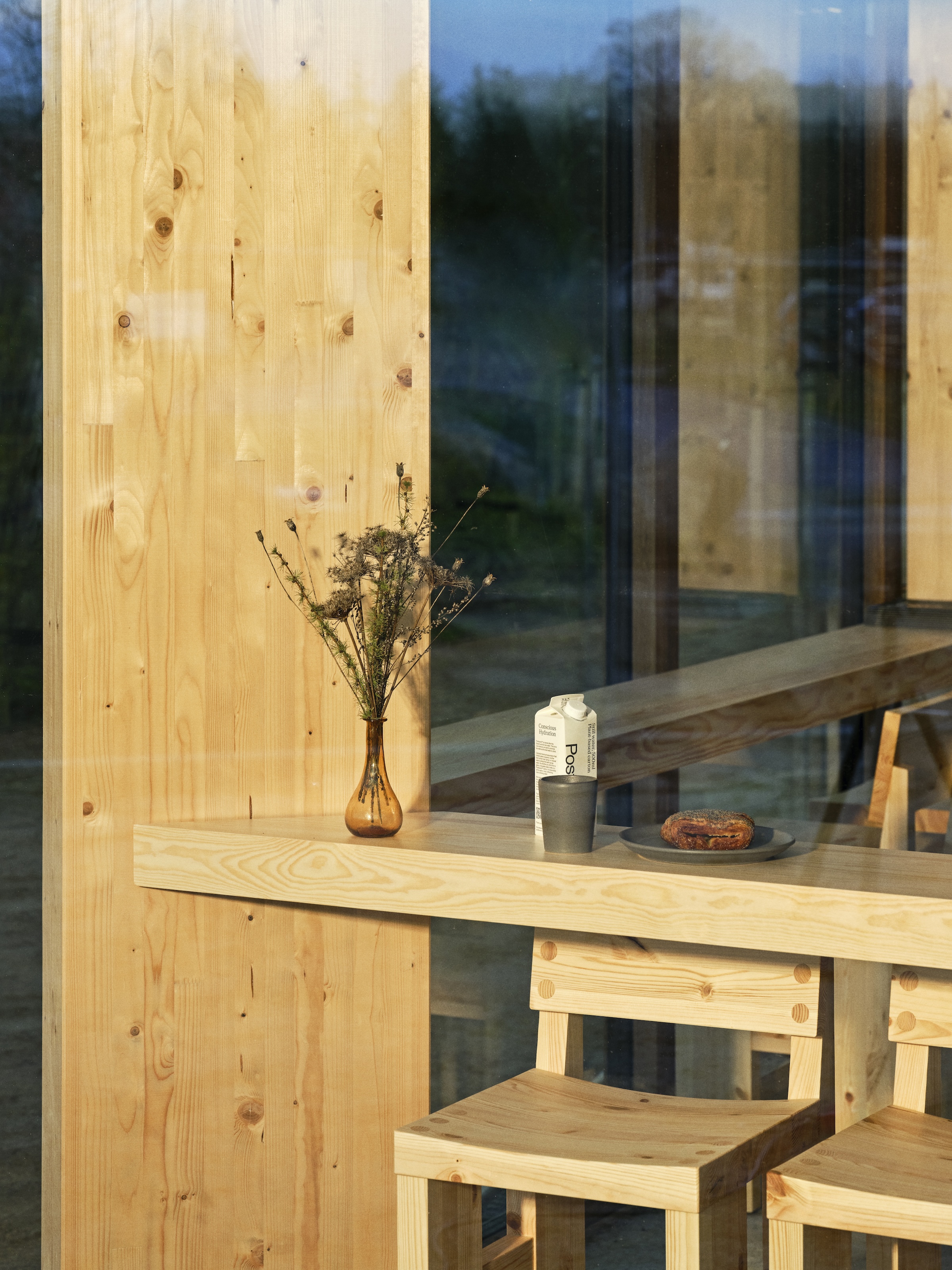Bygningen inviterer naturen indenfor med store glaspartier, naturlige materialer og en varm, menneskelig indretning, der står i skarp kontrast til motorvejens støj. Her er ingen gule tilbudsskilte, ingen automatkaffe, ingen stress. Kun et rum, der skaber ro.