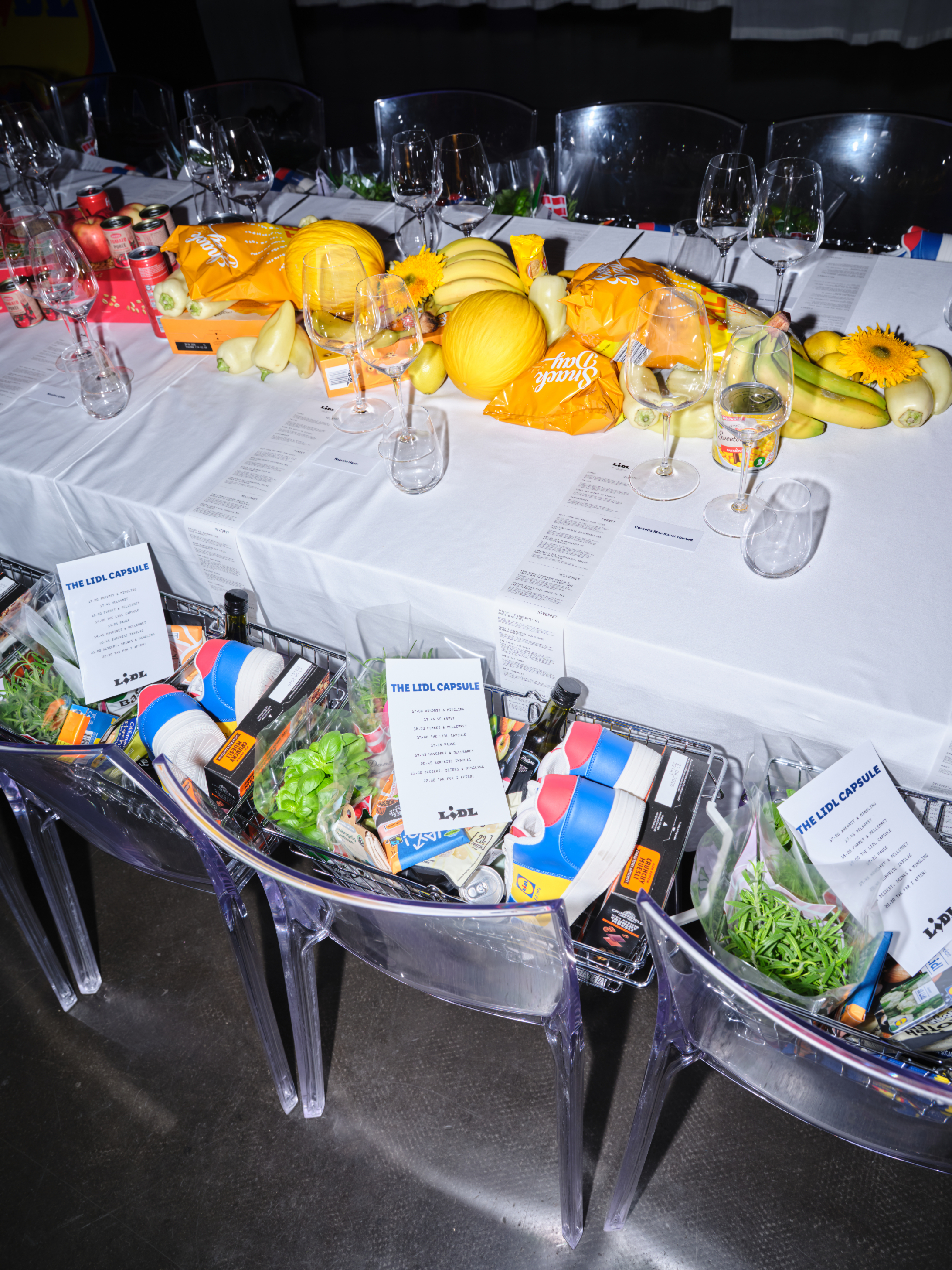 Udover modeshowet oplevede gæsterne en 20-retters social dining-menu, hvor hver ret repræsenterede et af Lidls initiativer eller produkter. Og det var lige fra farseret kyllingebryst som symbol på kædens stop med at sælge konventionelle hurtigvoksende turbokyllinger til appelsinglaserede gulerødder, der hyldede samarbejdet med danske producenter. Menuen var præsenteret som en butiksbon, og aftenen blev krydret med besøg af en tryllekunstner, en pop-up Lidl-butik og farverige balloner i kædens ikoniske blå og gule farver.