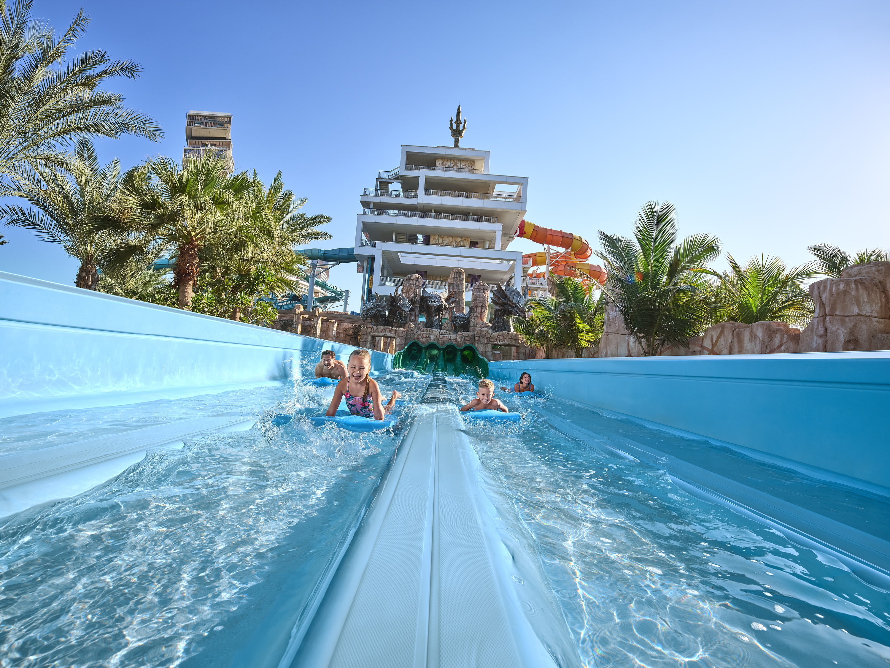 Aquaventure er kendt som en af Dubais mest populære attraktioner med mere end 105 vandrutsjebaner, attraktioner og oplevelser i verdensklasse. Her kan man både få adrenalinen til at pumpe på Raging Rapids eller nyde roen på den en kilometer lange private strand – en verdensberømt destination med noget for enhver smag.