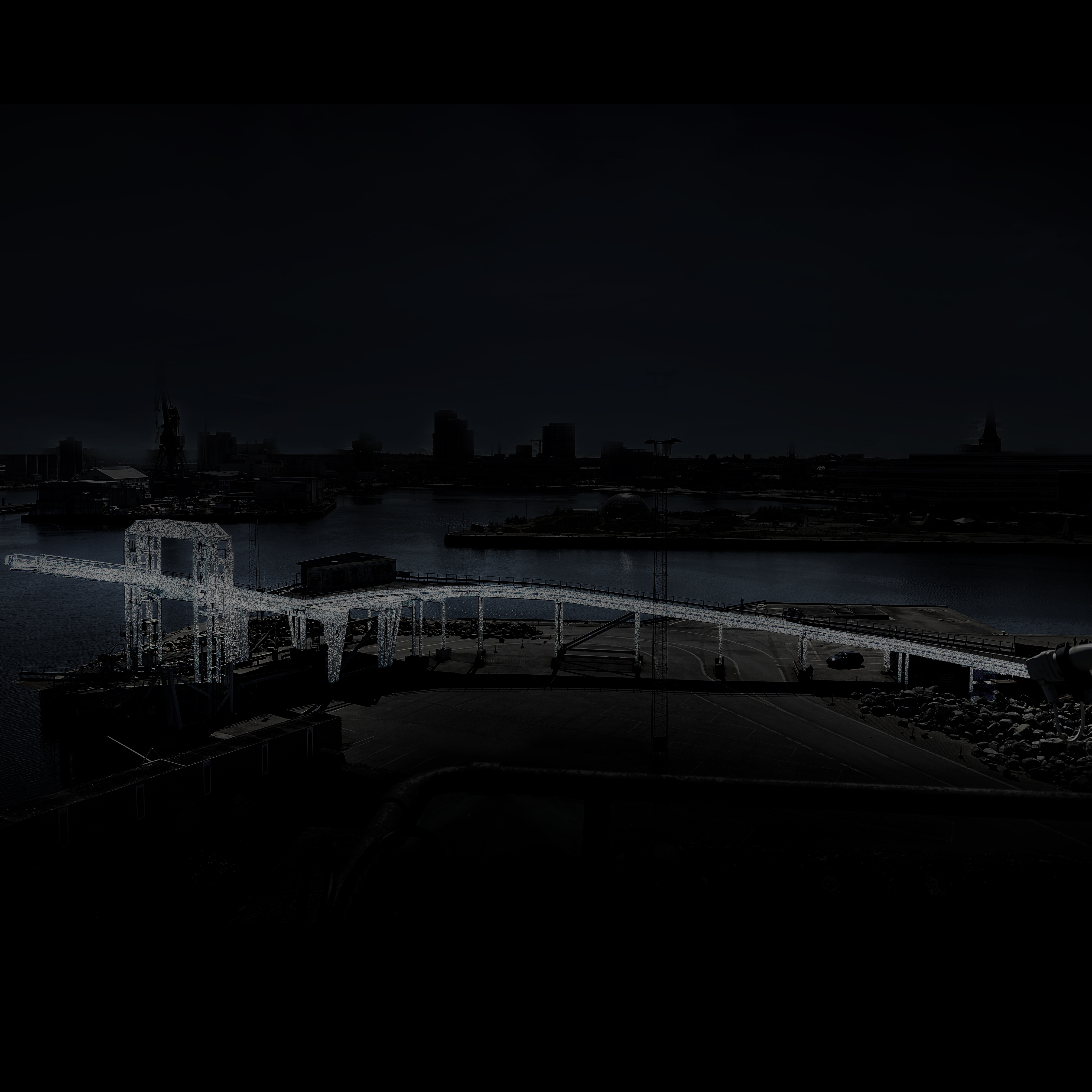 'GENKLANG' belyser den forladte rampe, der i sin funktion som kørerampe for Molslinjens bilfærger tidligere var en vigtig og velkendt forbindelse mellem Jylland og Sjælland. Værket lyser søgende gennem rampstrukturen efter en forbindelse til fortiden, som er udfordret - måske endda brudt – men hvis resonans stadig hænger i luften. Rendering af Elisabeth Holager Lund