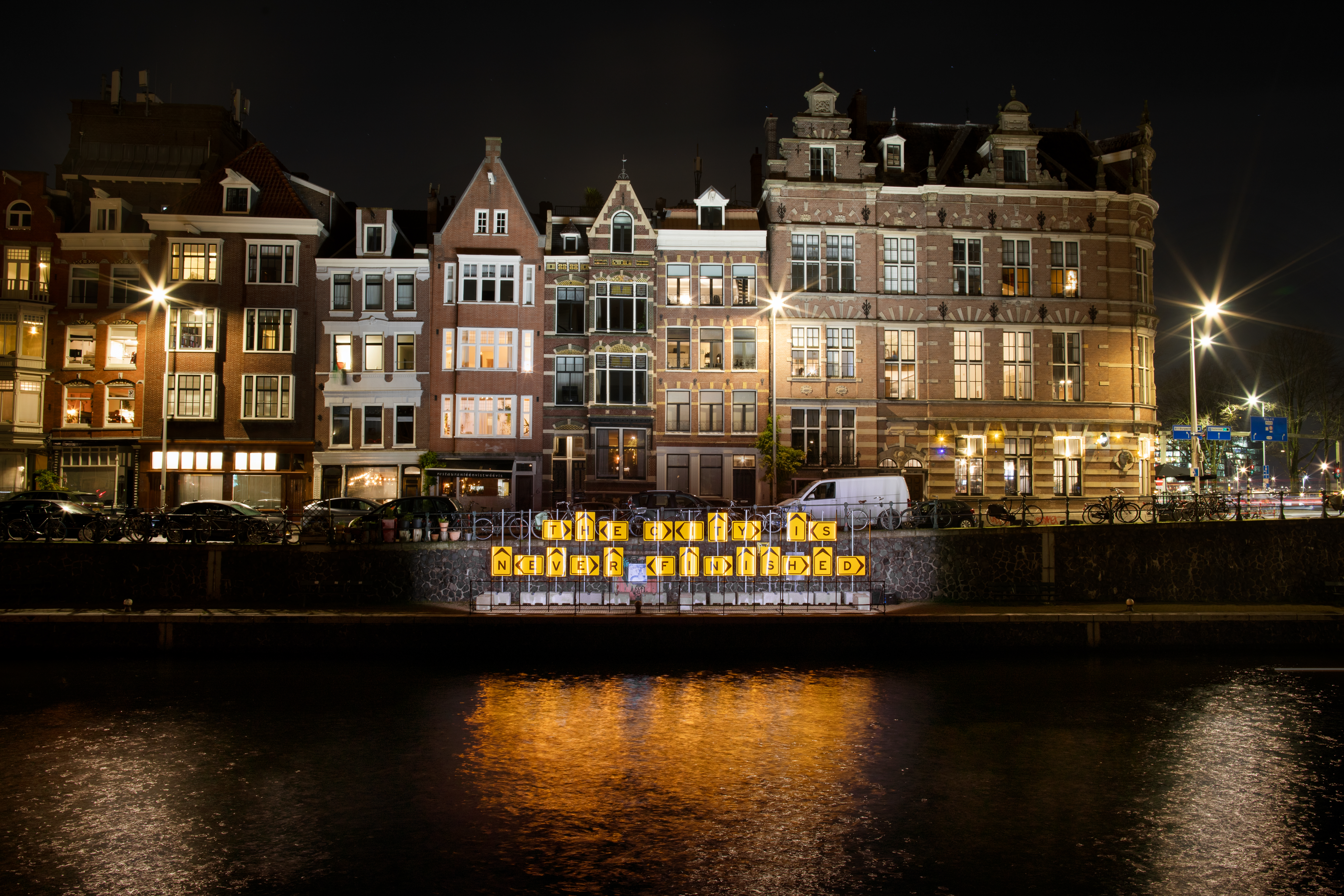 Aarhus er en by i konstant forandring, hvilket ikke altid huer trafikanter i byen. Kunstneren Tom Biddulph forvandler i sit værk 'The City is Never Finished' de velkendte gule omkørselsskilte til et mantra om omsorg for byen selv. Efter 1200 år er Aarhus stadig levende – og aldrig helt færdig. Billedet stammer fra Amsterdam Light Festival.