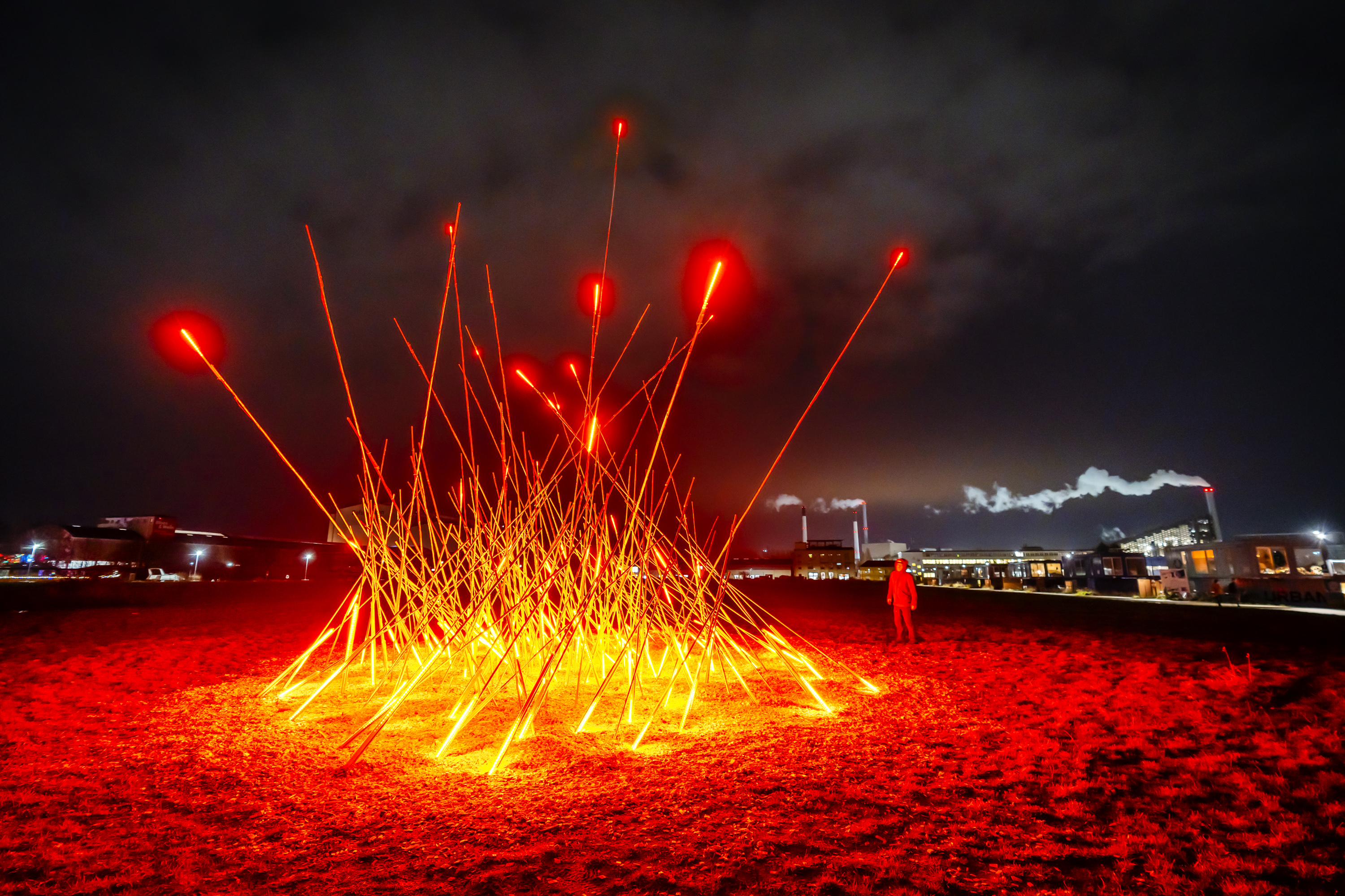 I Mølleparkens mørke rejser lysværket ’Fluxit’ sig som et glødende og gnistrende bål. Kunstnerduoen Vendel & de Wolf ønsker med værket at tematisere den rituelle betydning, et bål har i mange kulturer. Her bruges bålet som et varsel om en ny tid og til at jage onde ånder væk. Som et symbol på overgangen fra fortid til fremtid. Billedet stammer fra Copenhagen Light Festival