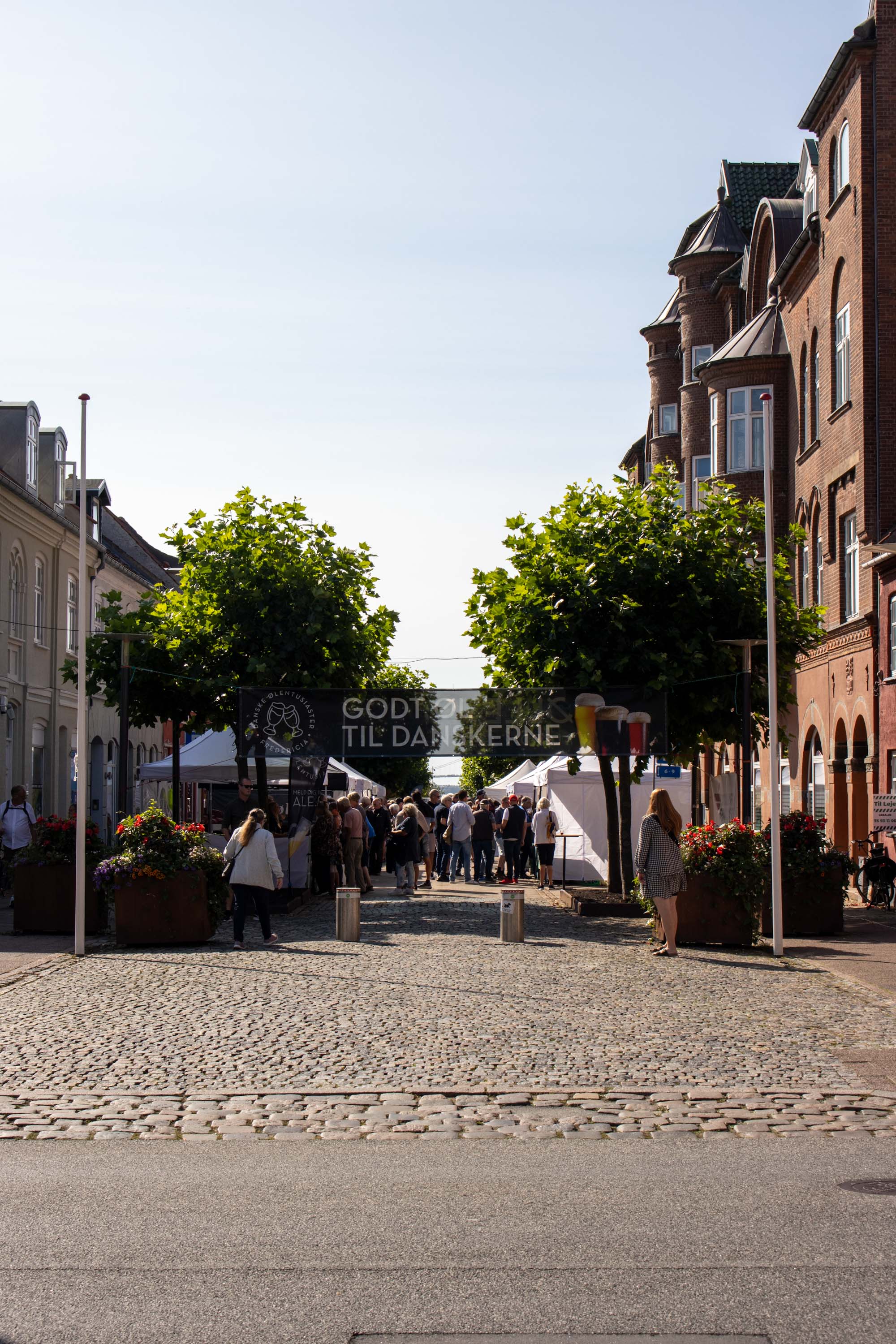 En travl gade i Fredericia under Øllets Dag med et banner, der siger "Godt øl til danskerne".