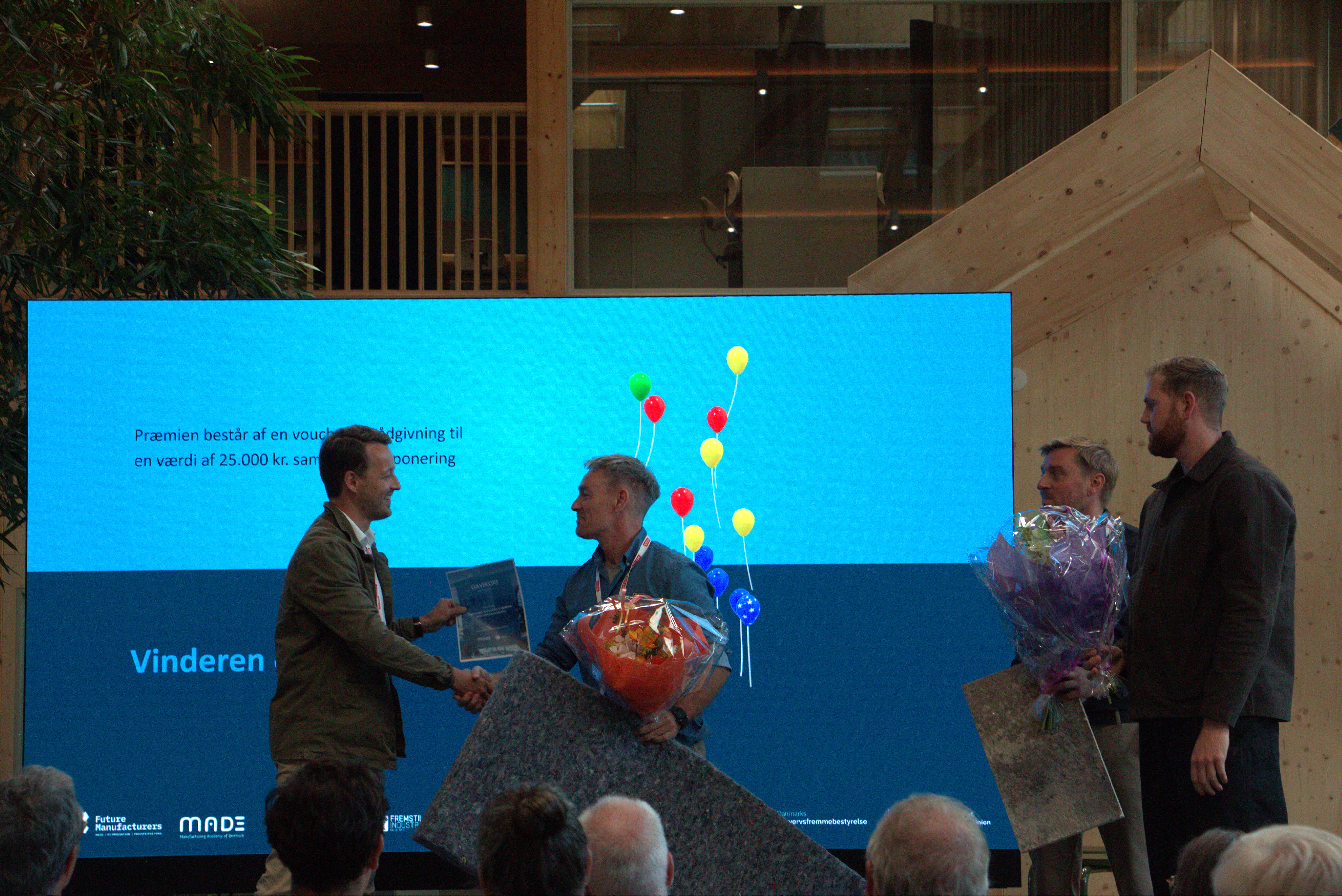 Til MADE Årsdag 2025 stemte deltagerne blandt tre finalister til prisen: Insutex, re-claim og Naturpladen. Her løb Insutex af med prisen og de 25.000 DKK.