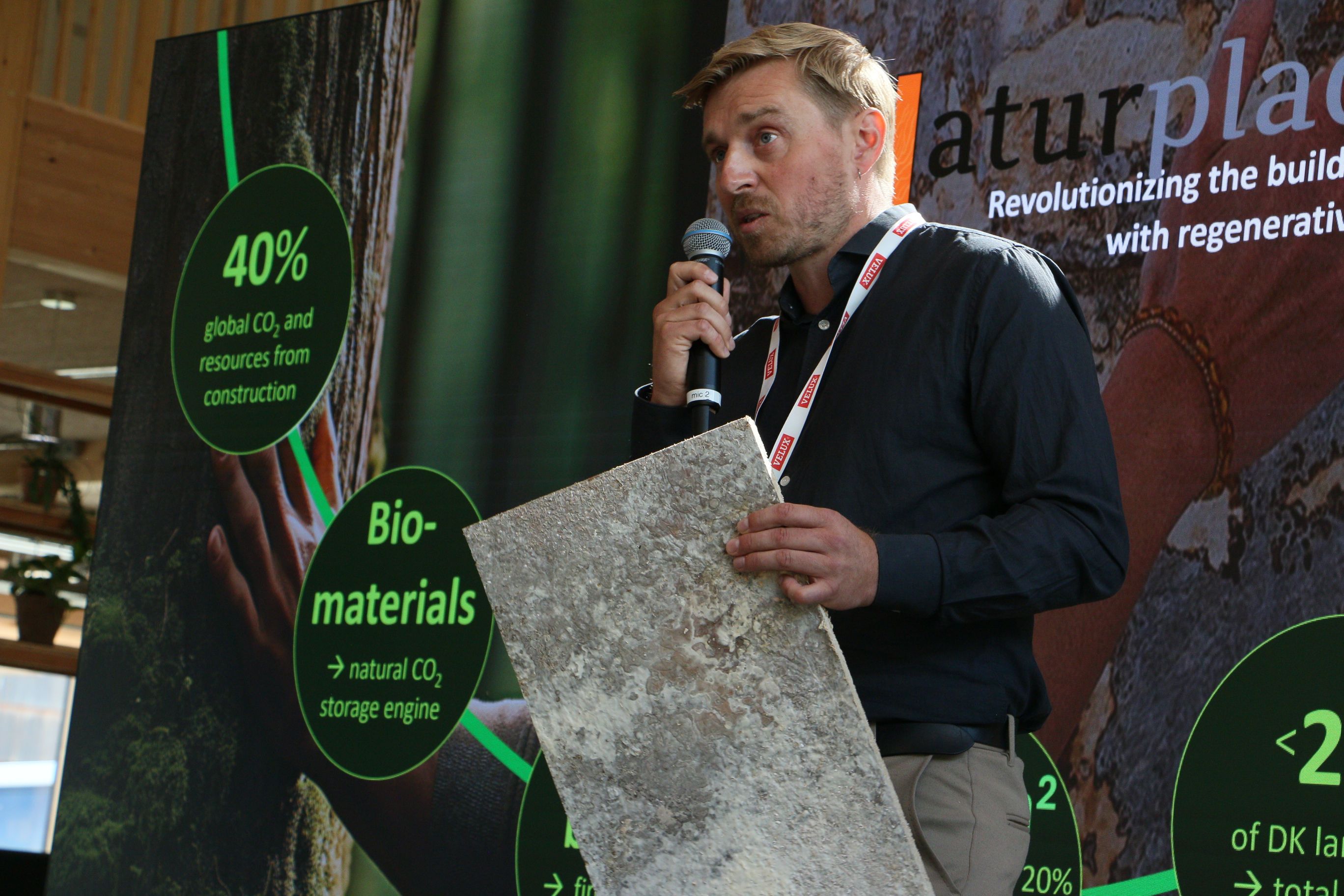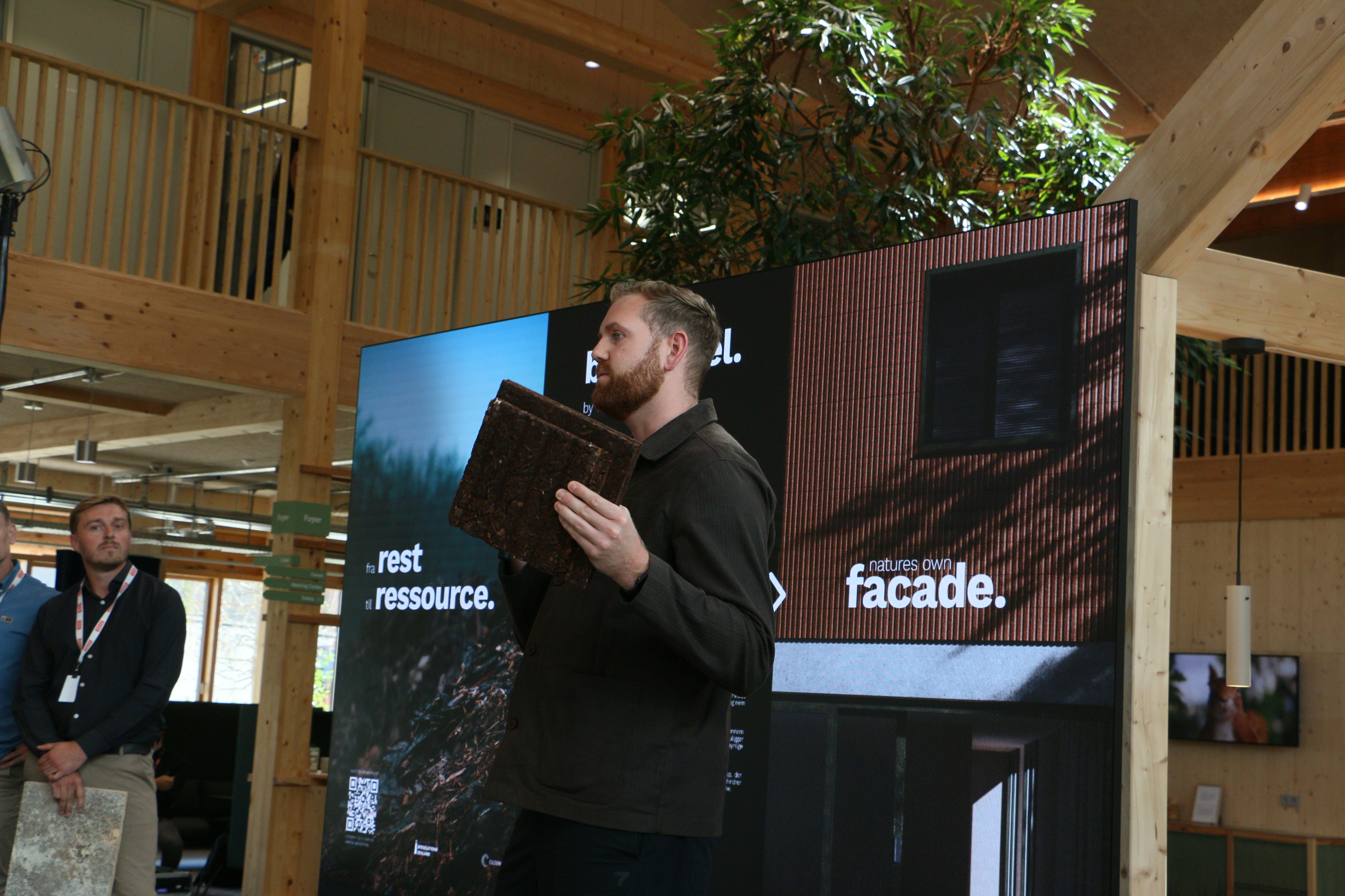 ”Vi er ikke konkurrenter, selvom vi står her på scenen sammen, men allierede. Vi har lært hinanden at kende gennem Future Manufacturers og har på den baggrund skabt fællesskabet Future Materials, hvor vi deler viden, søger finansiering og deltager i udstillinger sammen,” forklarer Frederik Ankjær på scenen, bakket op af Jon Strunge, CEO og stifter af Naturpladen, og Thomas Aspen fra Insutex.