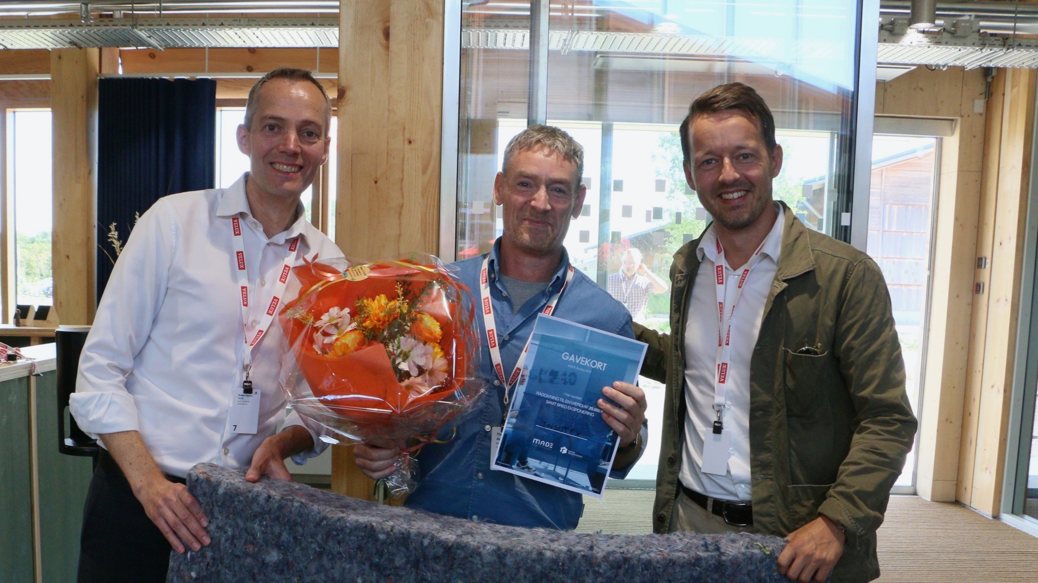 På scenen med ham stod de to andre nominerede, Naturpladen og re-claim – som tilfældigvis også arbejder med nye bæredygtige byggematerialer. Før vinderen blev annonceret, forsikrede medstifter af re-claim Frederik Ankjær, at der var god stemning mellem konkurrenterne:
