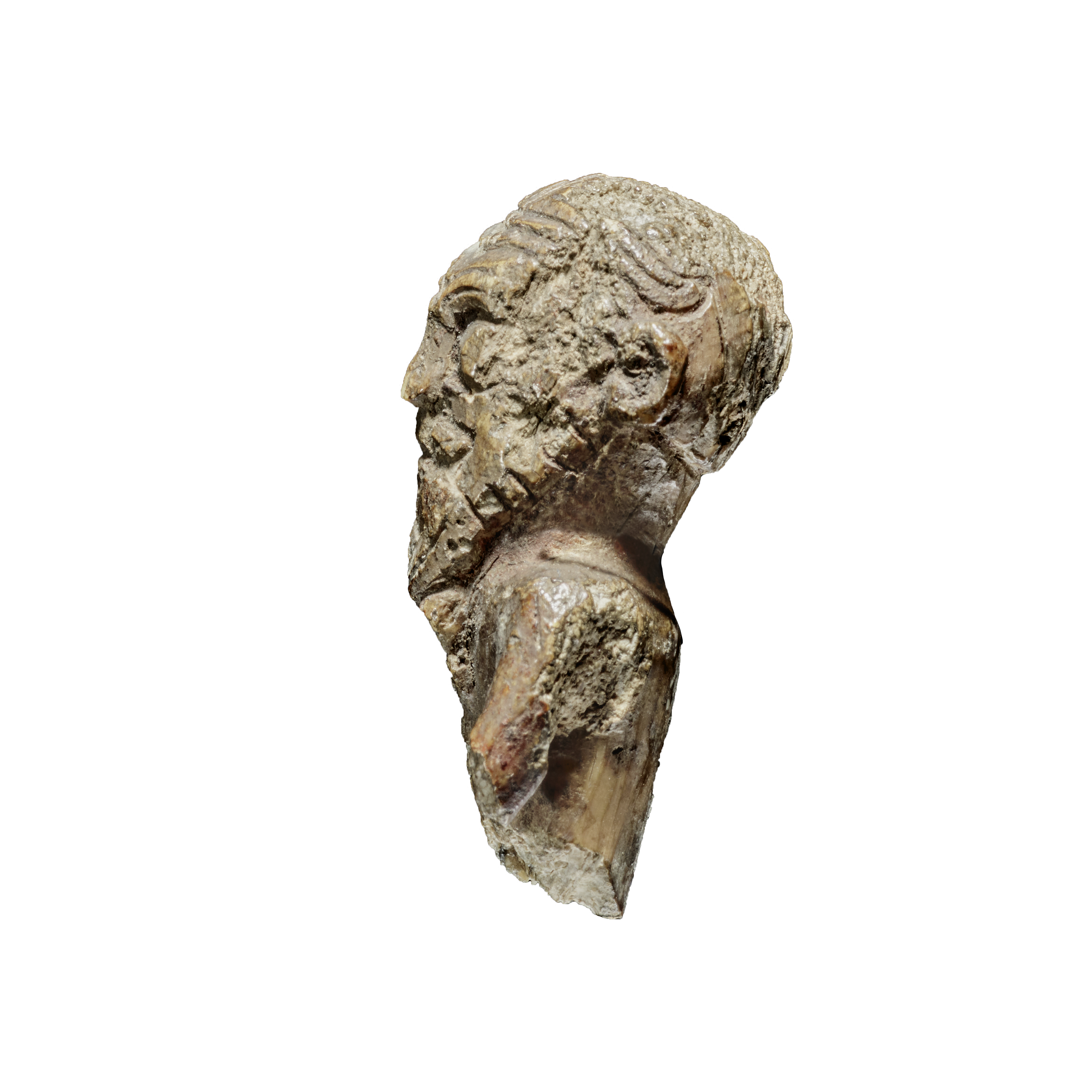 The hairstyle on the figurine, which is partially damaged, can be described as middle parting with a side wave that leaves the ear visible, while the hair has been cropped at the back. The figurine moreover sports a large moustache, a long, braided goatee and sideburns.