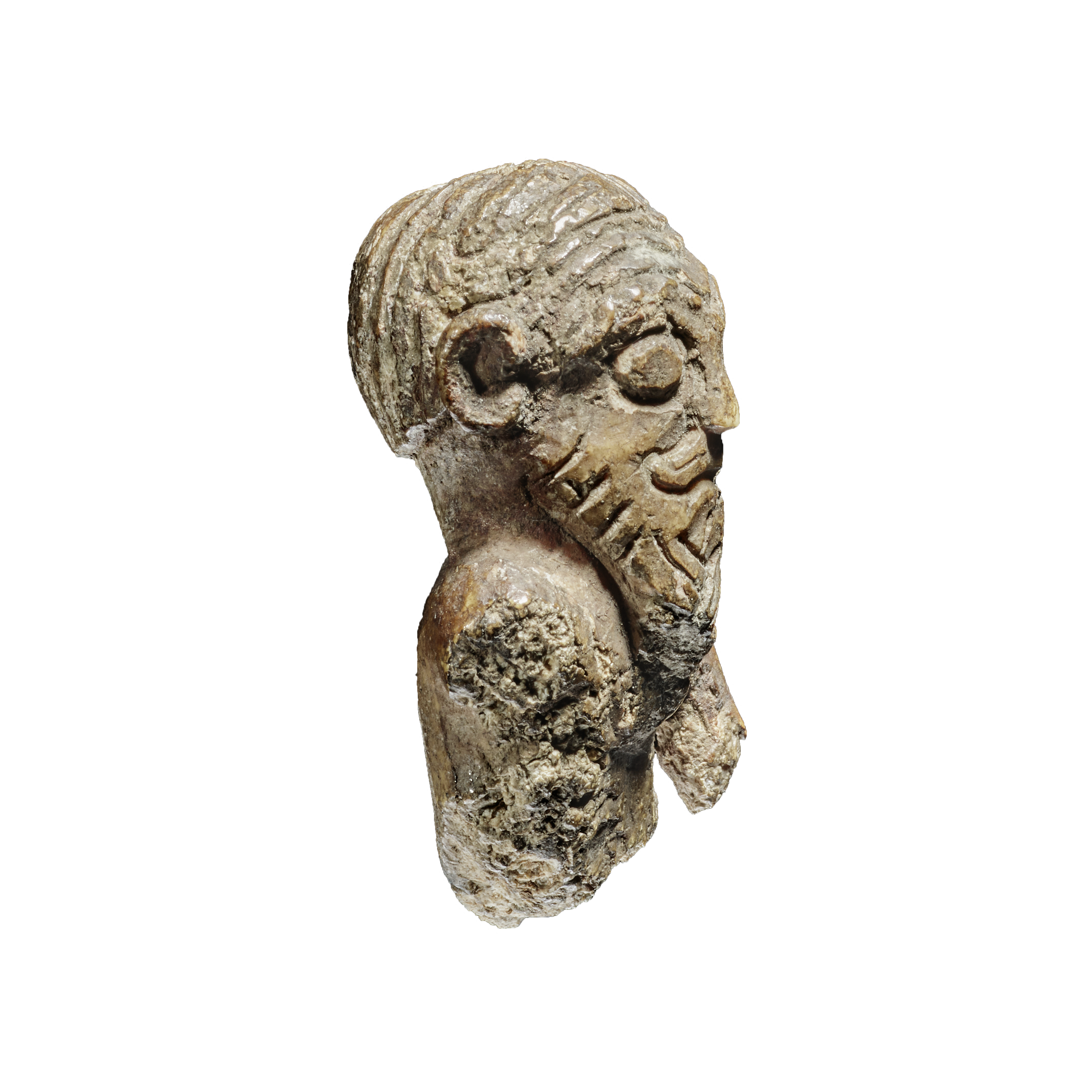 The gaming piece is just 3 cm of height, but it depicts the head and torso of a Viking with a shrewd expression on his face and an unusual, ornate hairstyle.