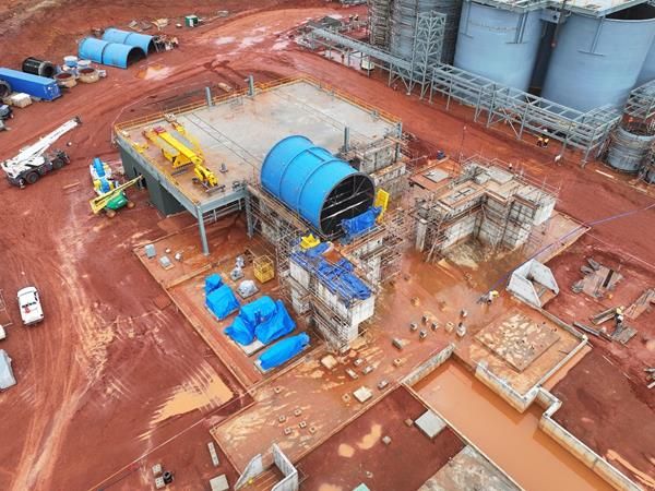 The SAG mill trunnion bearing housings were installed on the mill foundations and aligned. Six SAG mill shell segments have been erected and flange bolting is ongoing. SAG mill heads and trunnions arrived at port and are awaiting customs clearance. SAG mill lubrication skids were positioned in place.