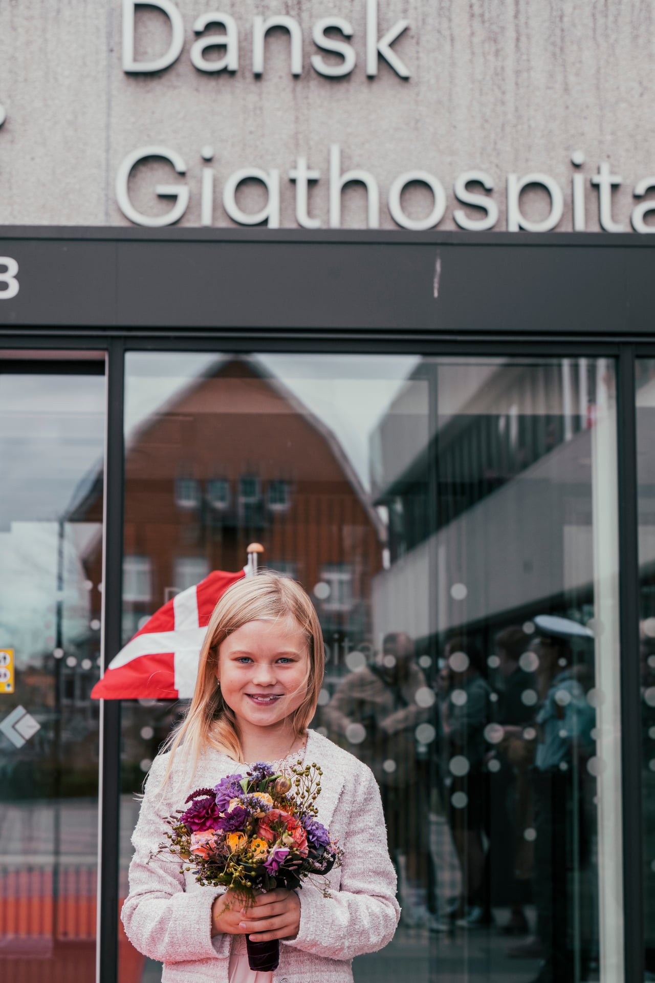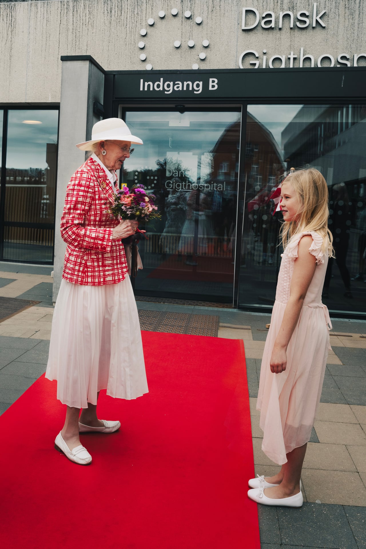 "Det er altid dejligt at møde andre med gigt, fordi de forstår, hvordan det er", siger 9-årige Ida Lundberg Thornval, som overrakte blomster til Dronning Margrethe ved ankomsten til Dansk Gigthospital. Ida fik diagnosen børneleddegigt, da hun var bare tre år. Hun bor i Virum og går i 3. klasse.