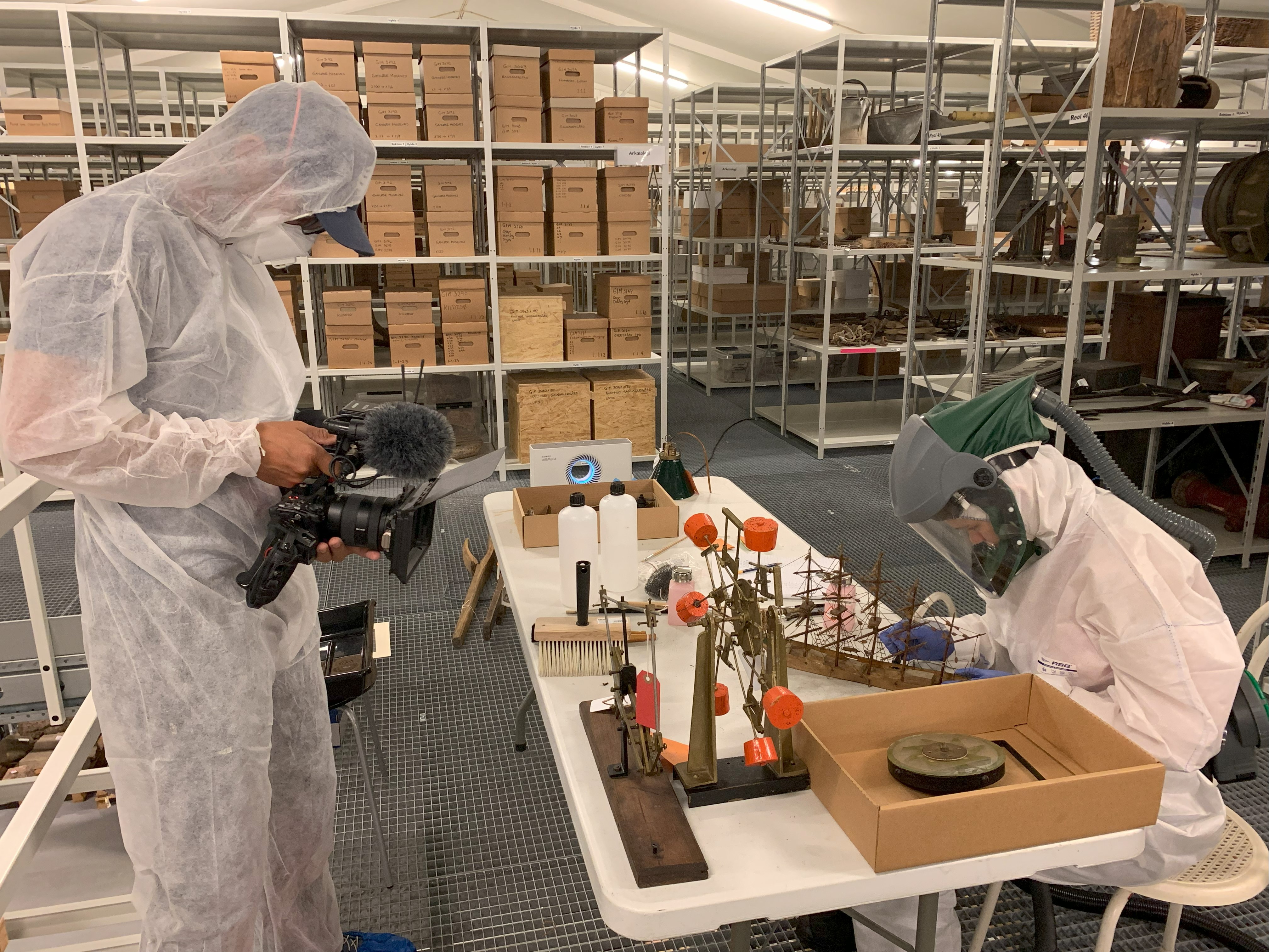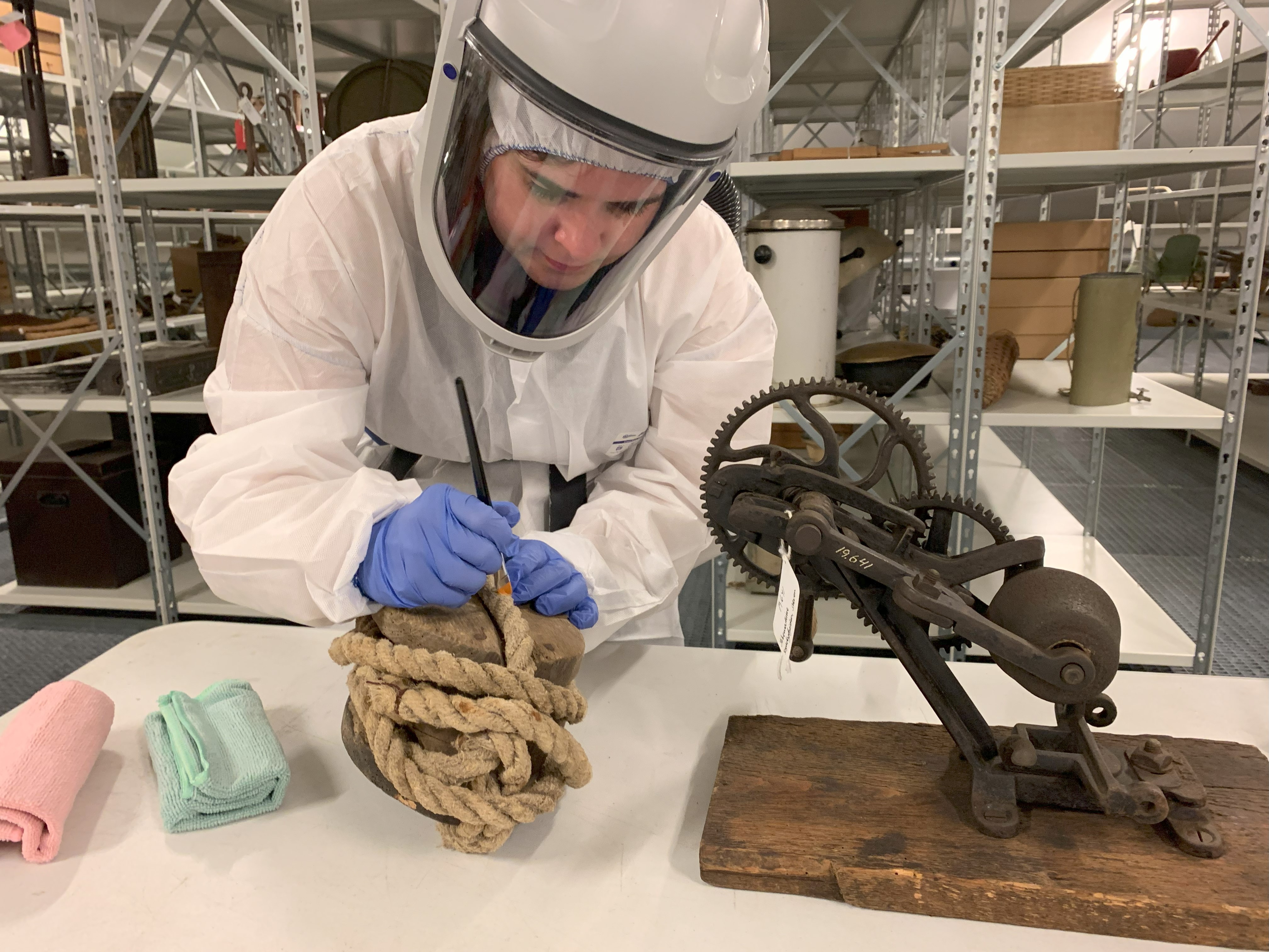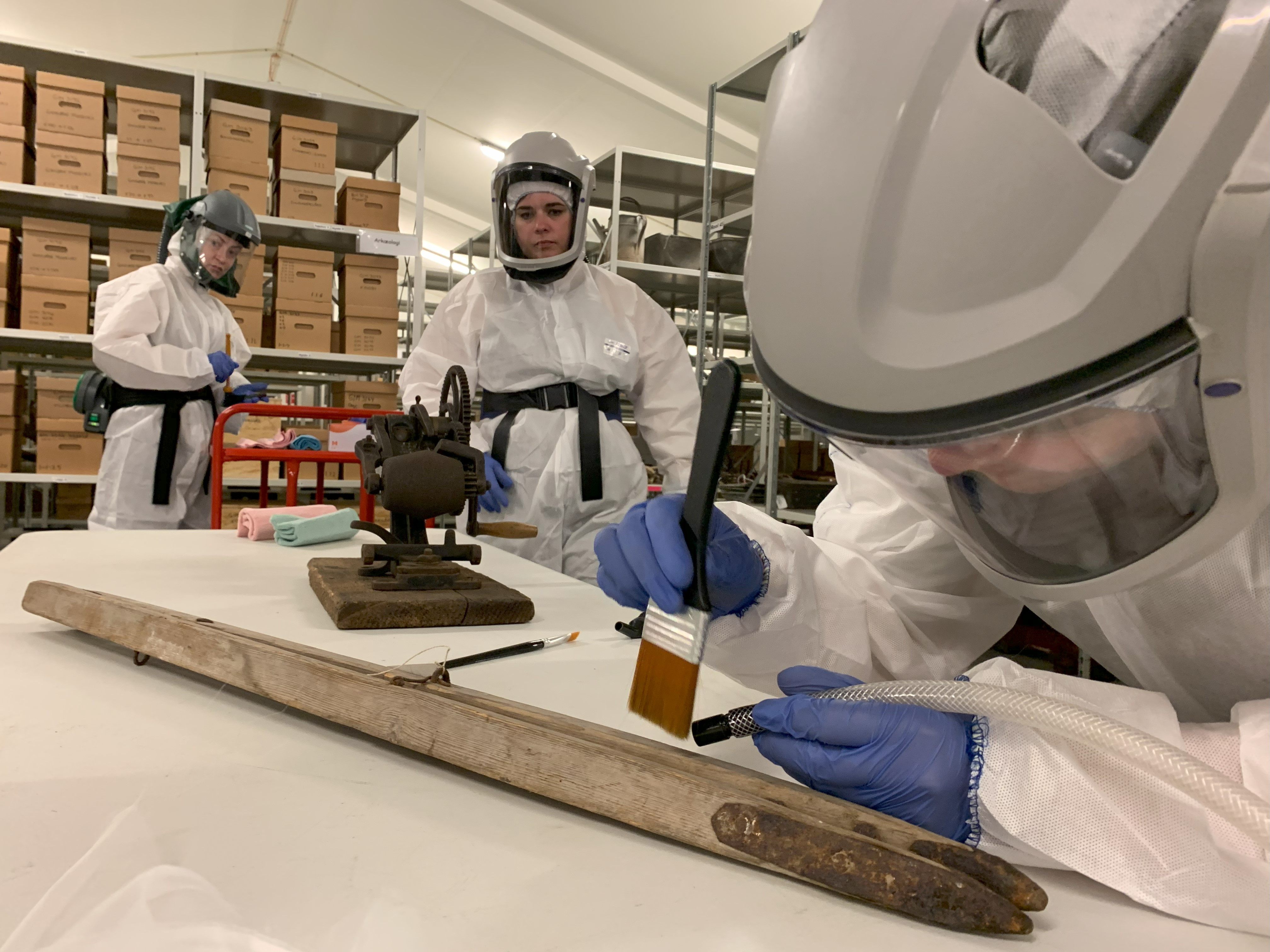 ”Vi er rigtig langt med at rengøre alle lofter, gulve, vægge og hylder, og vi tager hver enkelt genstand i hånden og afrenser den. Det kan være alt fra en kasse med knoglematerialer til en hestevogn. Alt skal gøres rent,” siger publikums- og samlingschef Isabella No’omi Fuglø.