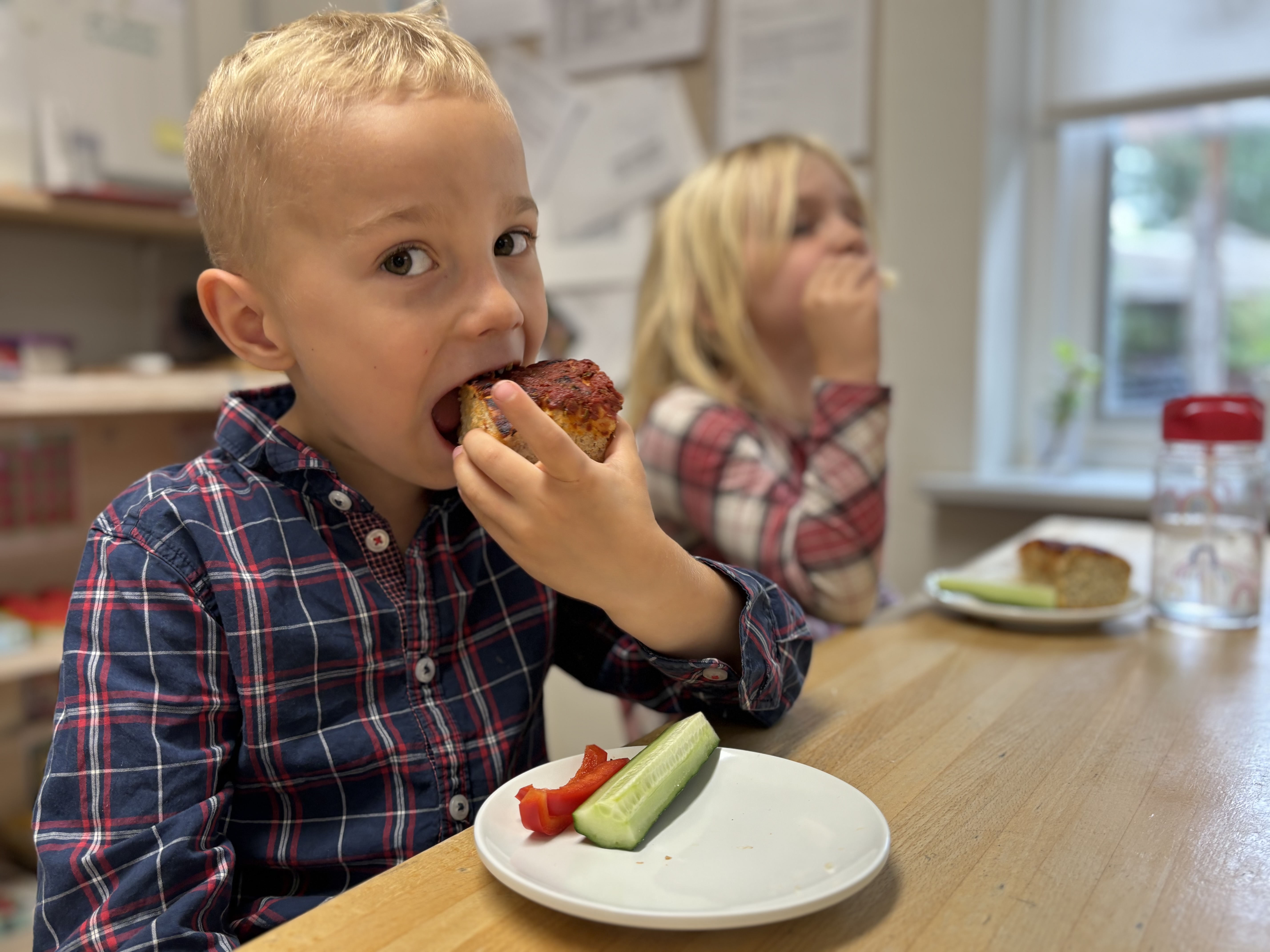 - Det er mega lækkert, udbryder Felix på 5 år efter at have sat tænderne i det, han kalder en pitabolle. I virkeligheden er det et fuldkornsbrød med tomat og hvidløg på toppen.