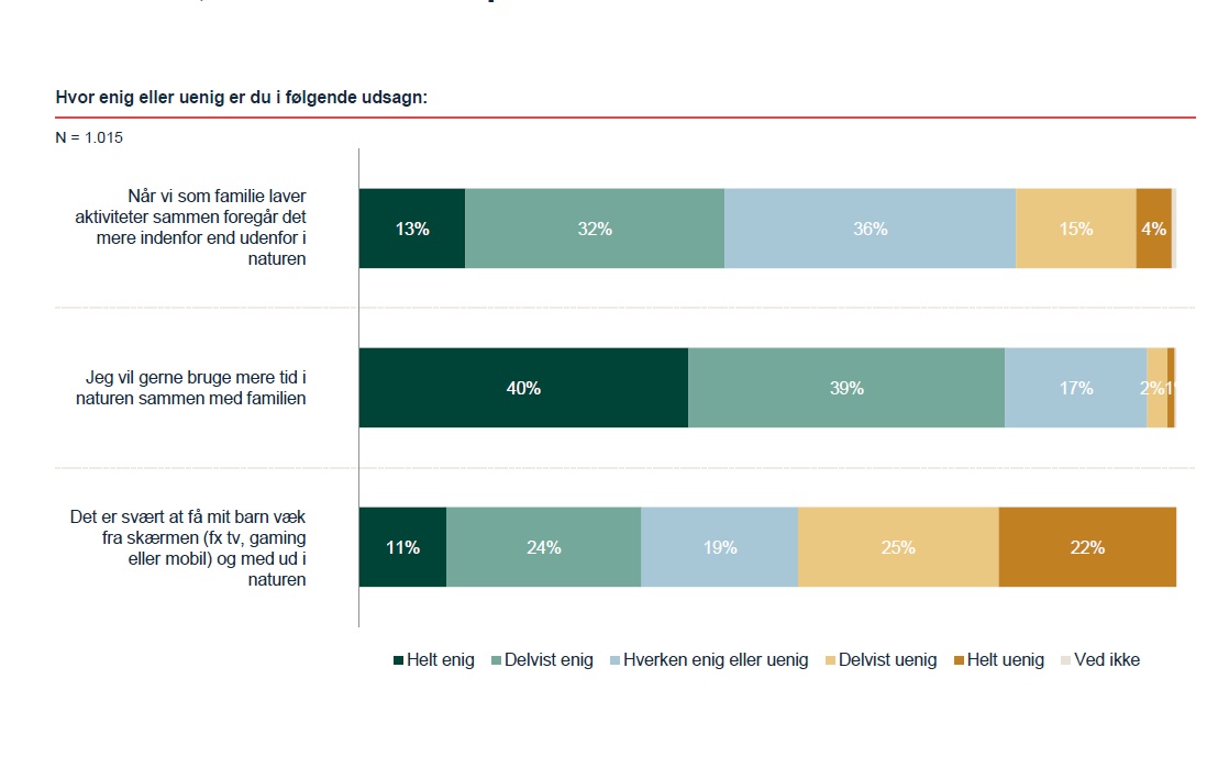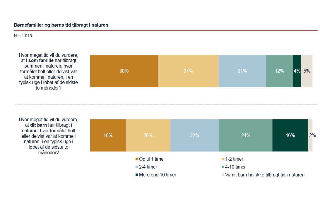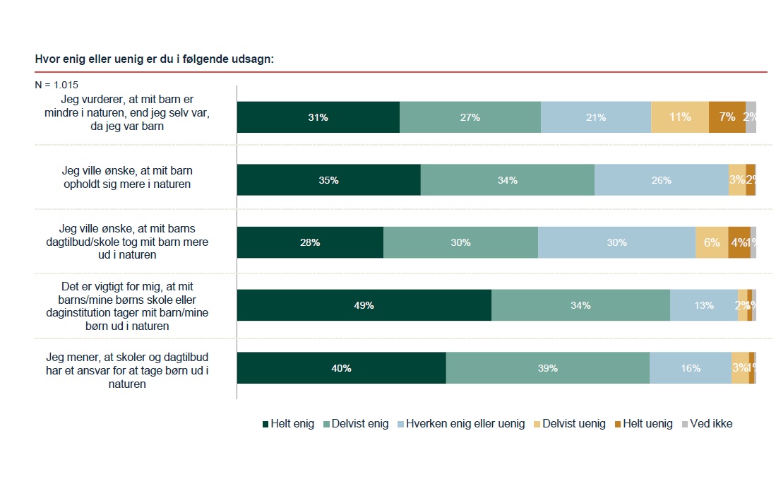 Her svarer 69 pct. af forældrene, at de ville ønske, at deres barn opholdt sig mere i naturen. Samtidig vurderer 58 pct., at de selv tilbragte mere tid i naturen som børn.