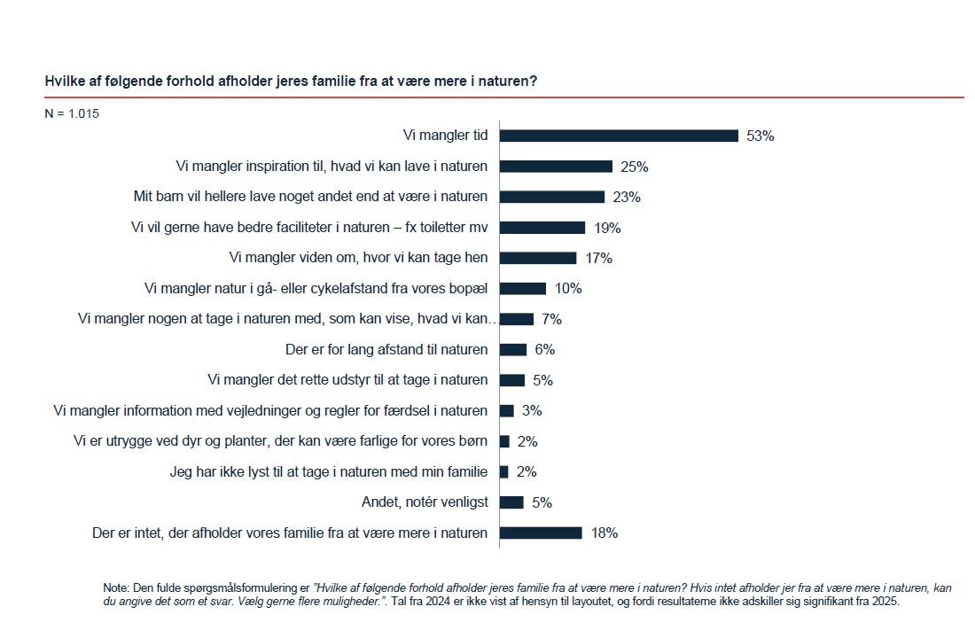 Netop konkurrence fra skærmene er udfordring for mange. Godt hver tredje forælder (35 pct.) oplever, at det er svært at få barnet væk fra skærmen og med ud i naturen. Mangel på tid er dog den barriere, der afholder allerflest familier fra at tilbringe mere tid i naturen (53 pct.).