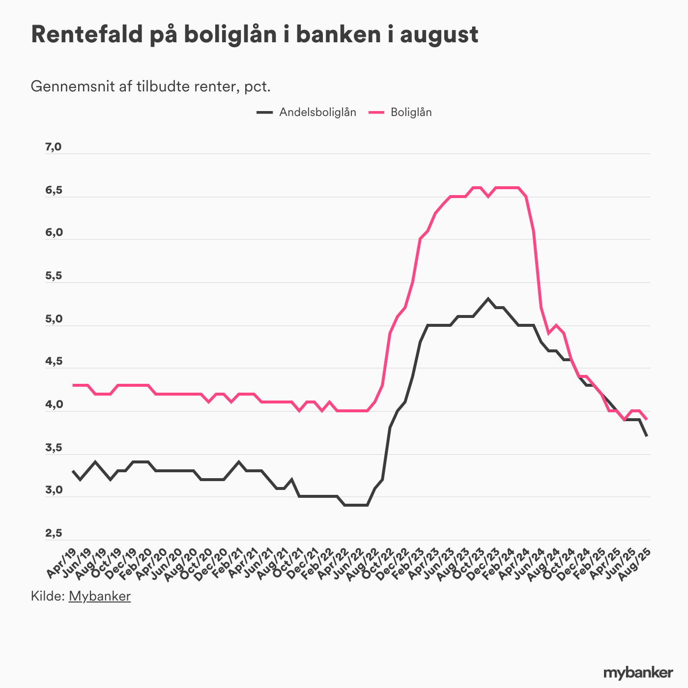 August måned bød på nye fald i bankernes renter på både bolig- og andelsboliglån. Det viser denne måneds rentestatistik fra Mybanker.