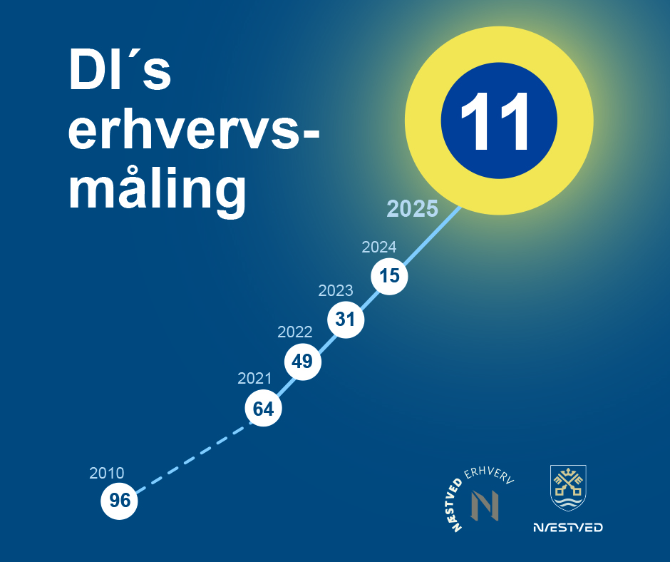 For fjerde år i træk springer Næstved Kommune op ad i Dansk Industris årlige undersøgelse af kommunernes erhvervsvenlighed i Danmark - fra en plads som nummer 64 i 2021 til en plads som nummer 11 i 2025. Og for andet år i træk bliver kommunen desuden vurderet til at være Sjællands mest erhvervsvenlige kommune.