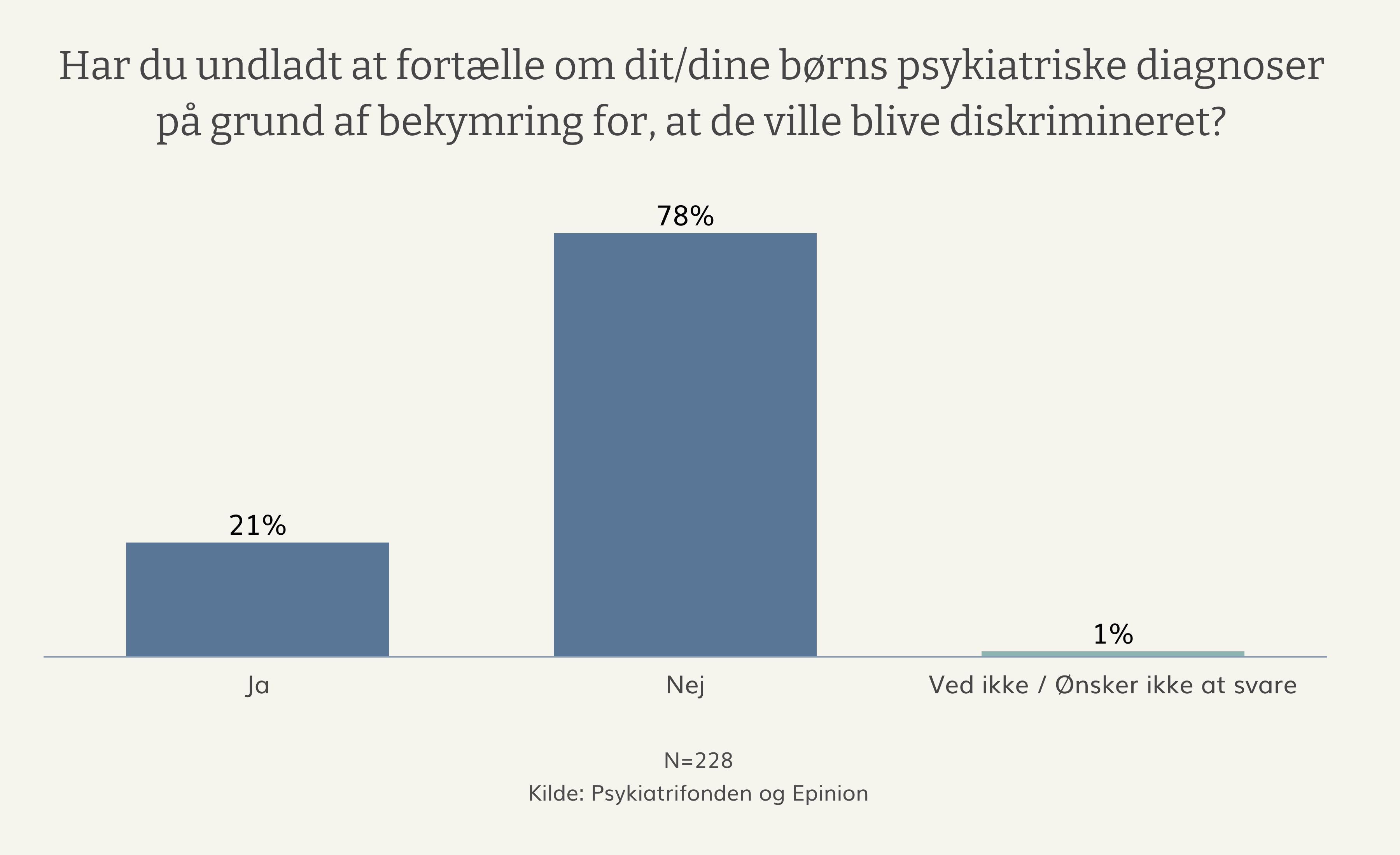 Hver femte forælder, der har en psykiatrisk diagnose, har holdt barnets diagnose skjult af frygt for, at barnet ville blive mødt af fordomme og misforståelser. En mindre andel af forældrene har udskudt eller undladt at lade deres barn blive udredt.