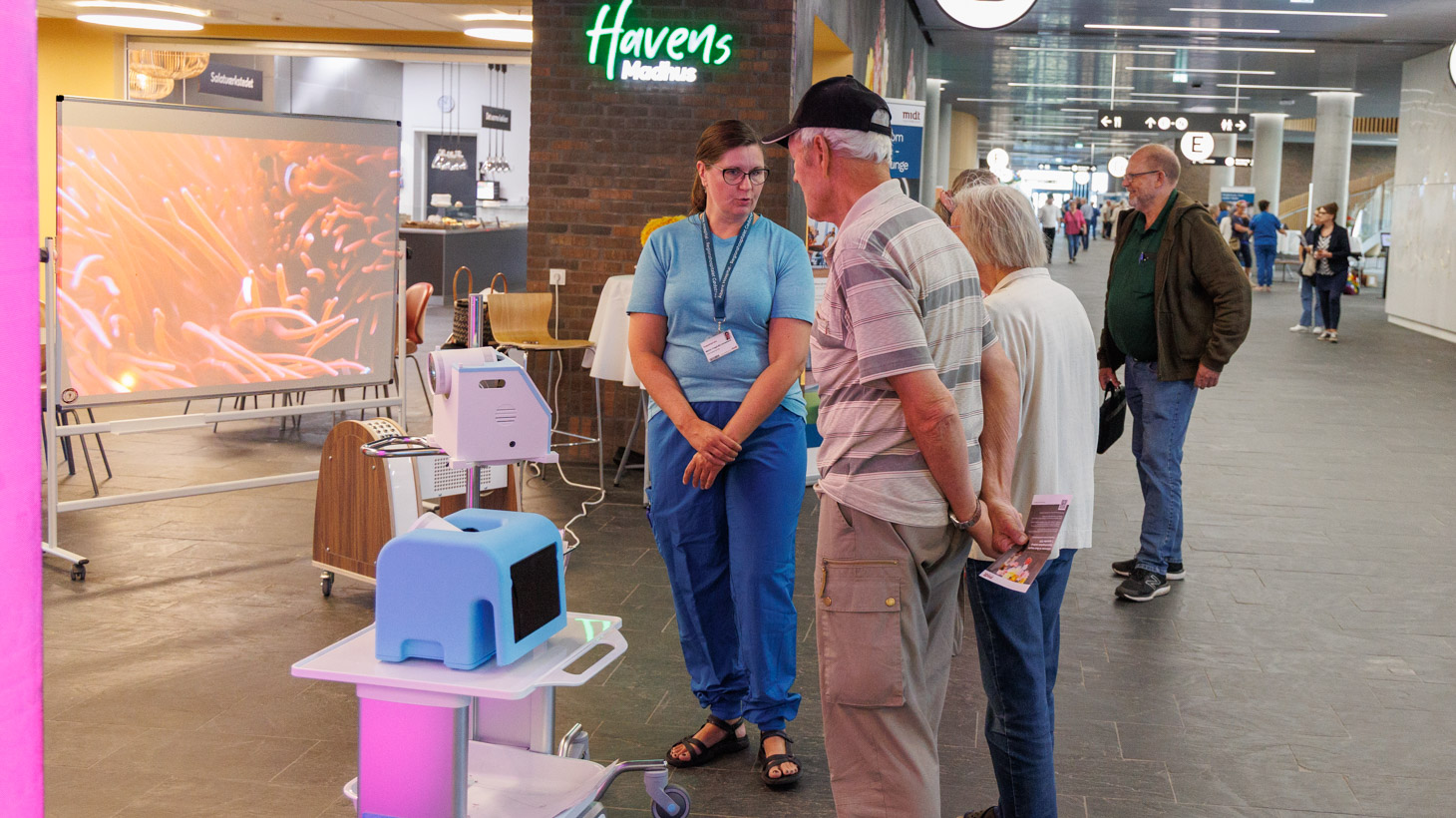 Her kunne gæsterne blandt andet se animationer fra den interaktive skadestue for børn i Akutmodtagelsen, prøve kræfter med kreativ skrivning på Neurologisk Afdeling, lytte til en lydrejse designet til forældre, der har mistet et barn på Fødeafdelingen - og høre om delirstuen, en særlig sengestue på Urinvejskirurgisk Sengeafsnit, hvor sanserne falder til ro og delir forsøges mindsket.