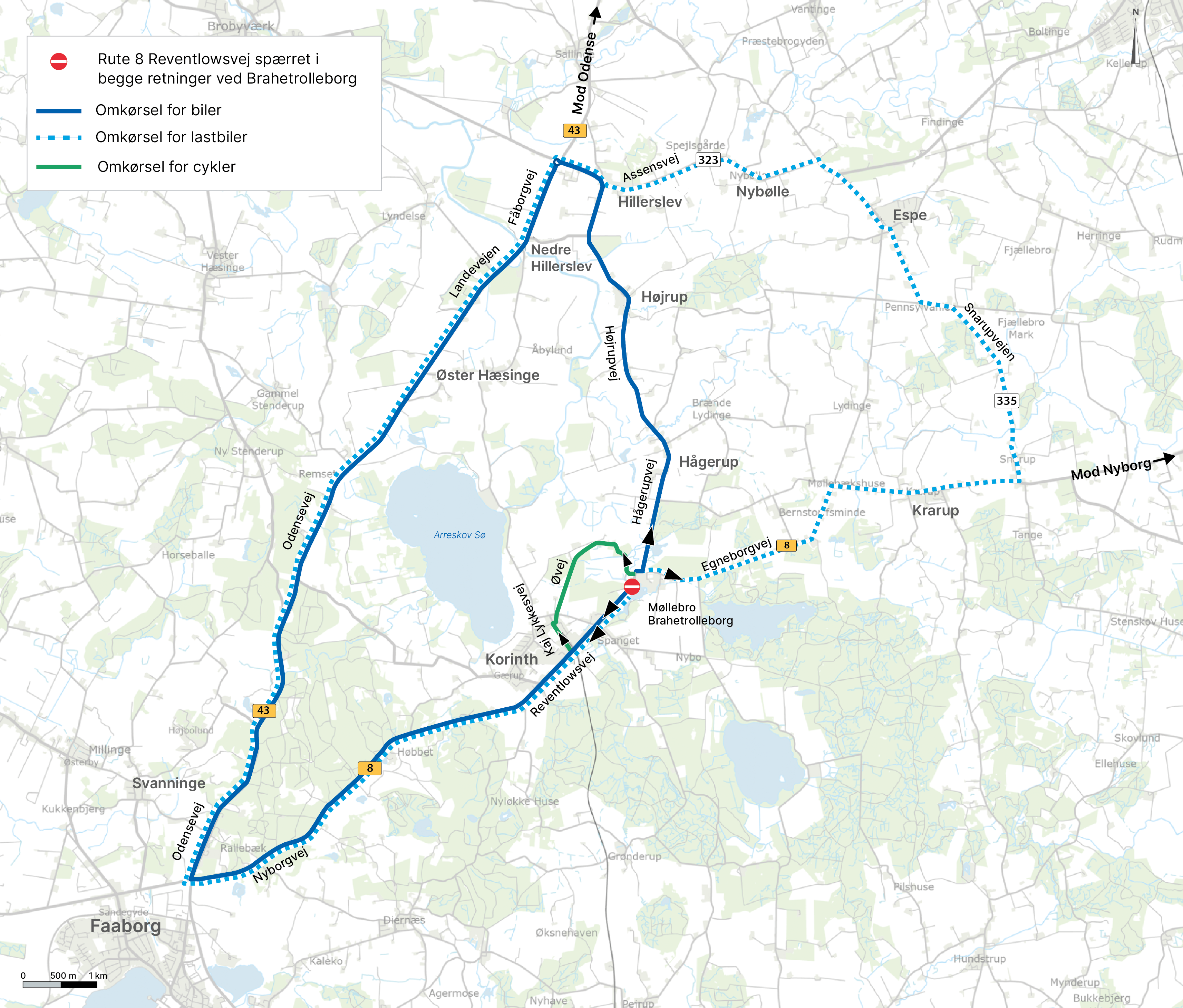 Der vil i perioden være omkørsel for bilister og lastbiler via Hågerupvej/Fåborgvej og/eller Nyborgvej/Odensevej, som vist i vedlagte omkørselsvejledning for bilister. Lastbiler skal dog køre fra tidligere end personbiler, som det også fremgår af kortet. Cyklister kan benytte stierne ad Øvej/Kaj Lykkesvej.