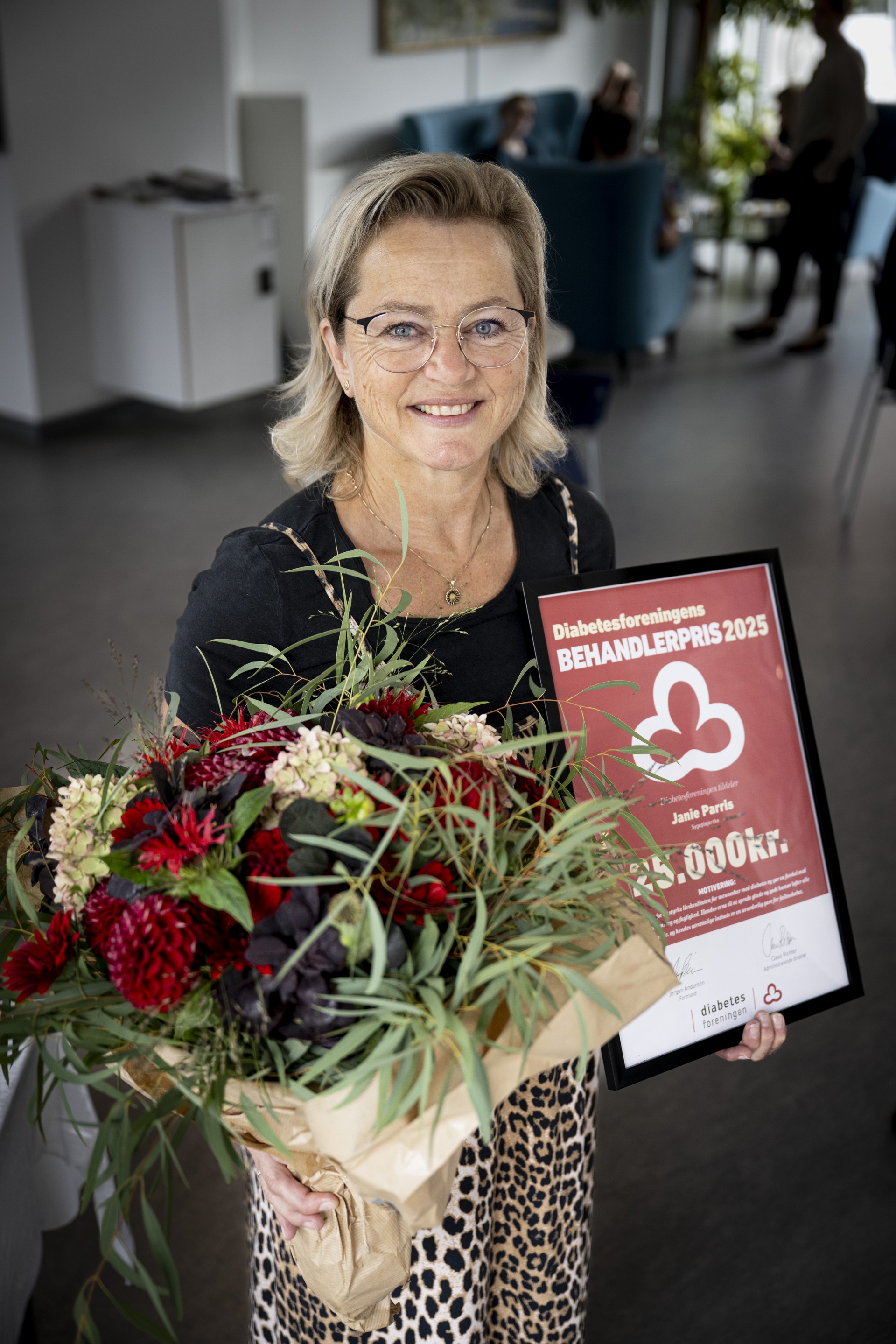Janie Parris fik overrakt prisen i Faxe Sundhedscenter, hvor hun hver måned samler tre hold af 20 mennesker med diabetes og deres pårørende til undervisning, netværksgrupper og aktiviteter som madlavning og gang. Her inviterer hun også sundhedsfaglige eksperter som øjenlæger og fodterapeuter ind, så deltagerne får både ny viden, praktiske redskaber og inspiration med hjem.