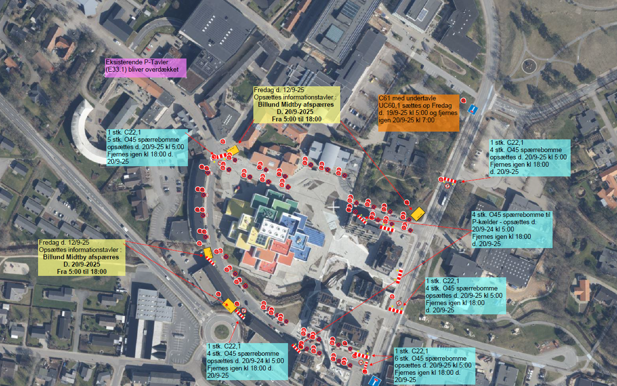 Den centrale bymidte omkring Byens Plads vil være afspærret. Dette omfatter Byens Plads, Gammelbro, Butikstorvet og Hans Jensensvej mellem Billund Centeret og Skolevej. - Lørdag den 20. september fra kl. 10:00–14:00: