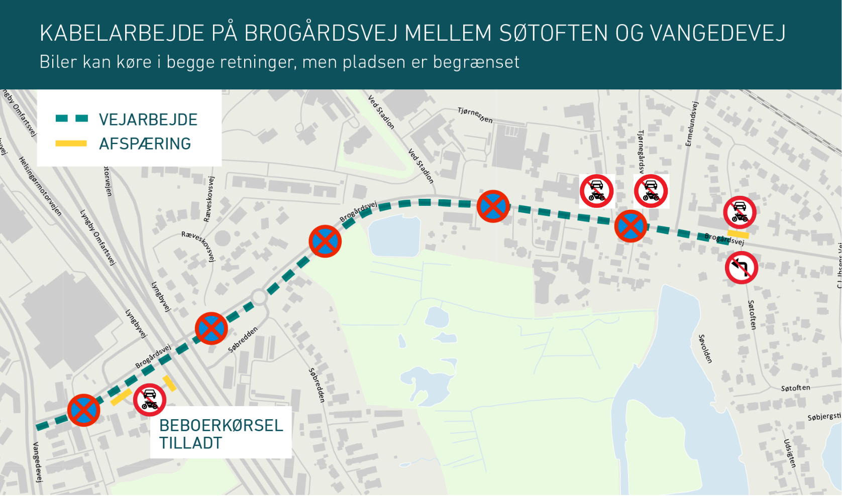 Onsdag 17. september flytter Energinets kabelarbejde længere mod vest på Brogårdsvej fra Søtoften ned til Vangedevej. Der vil være trafik i begge retninger, men vejen er indsnævret, parkering og standsning ikke tilladt, og ind- og udkørsel til flere sideveje samt indkørsler i den sydlige side af vejen bliver påvirket.