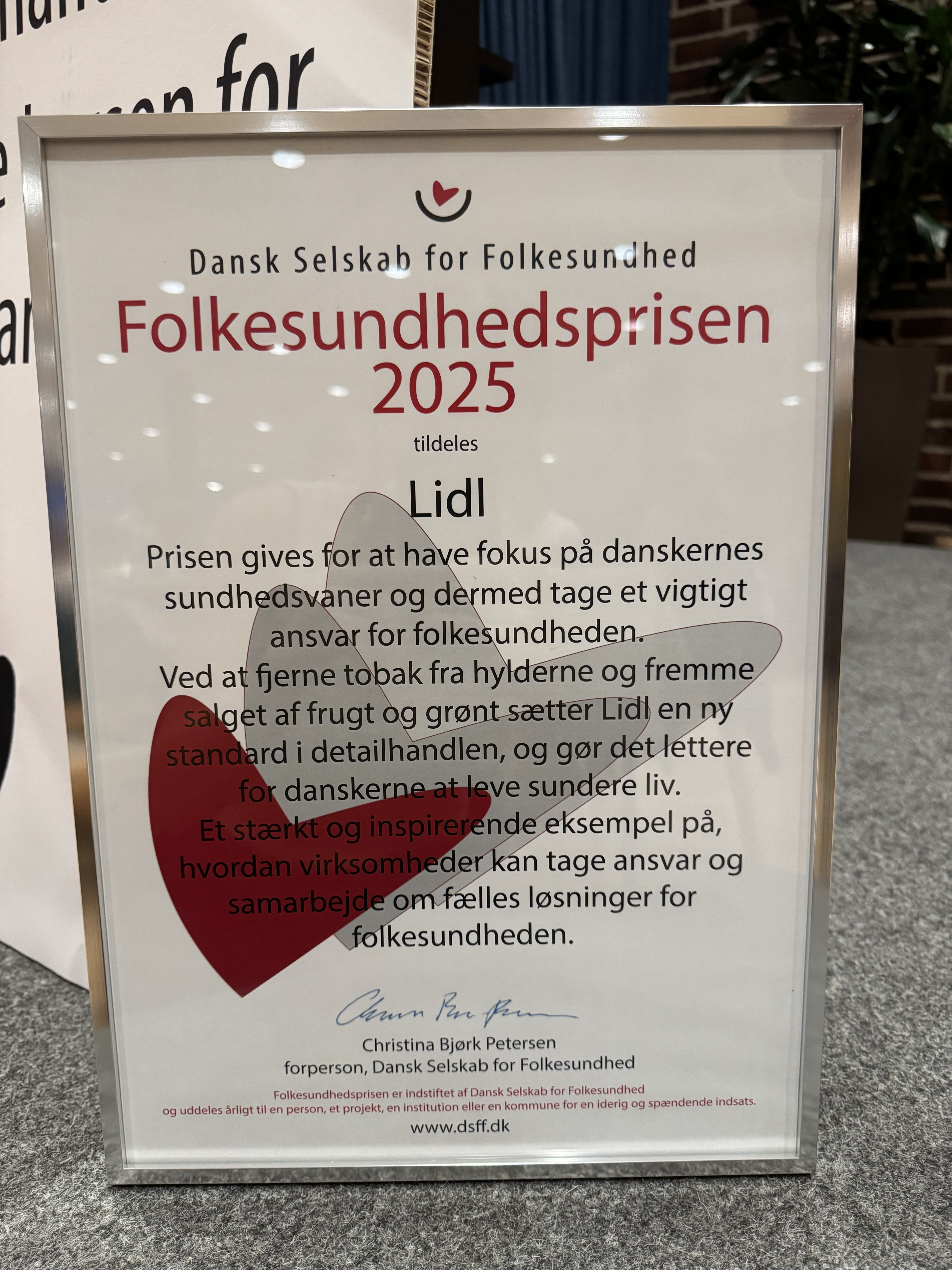 Med prisen skriver Lidl historie, da dagligvarekæden er den første kommercielle aktør, der modtager Folkesundhedsprisen nogensinde. En pris, der er blevet uddelt siden 2004 af Dansk Selskab for Folkesundhed. I begrundelsen står, at prisen er en anerkendelse af Lidls omfattende og målrettede arbejde for at fremme folkesundheden gennem dagligvarehandlen – blandt andet ved at fjerne tobak og nikotin fra hylderne og fremme salget af frugt og grønt.