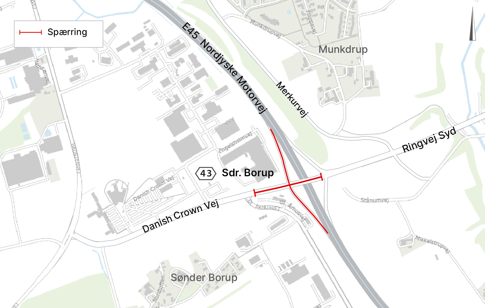 Spærringen skyldes, at der skal laves en del større ændringer i det lysregulerede kryds vest for den udvidede bro ved Sdr. Borup <43>.