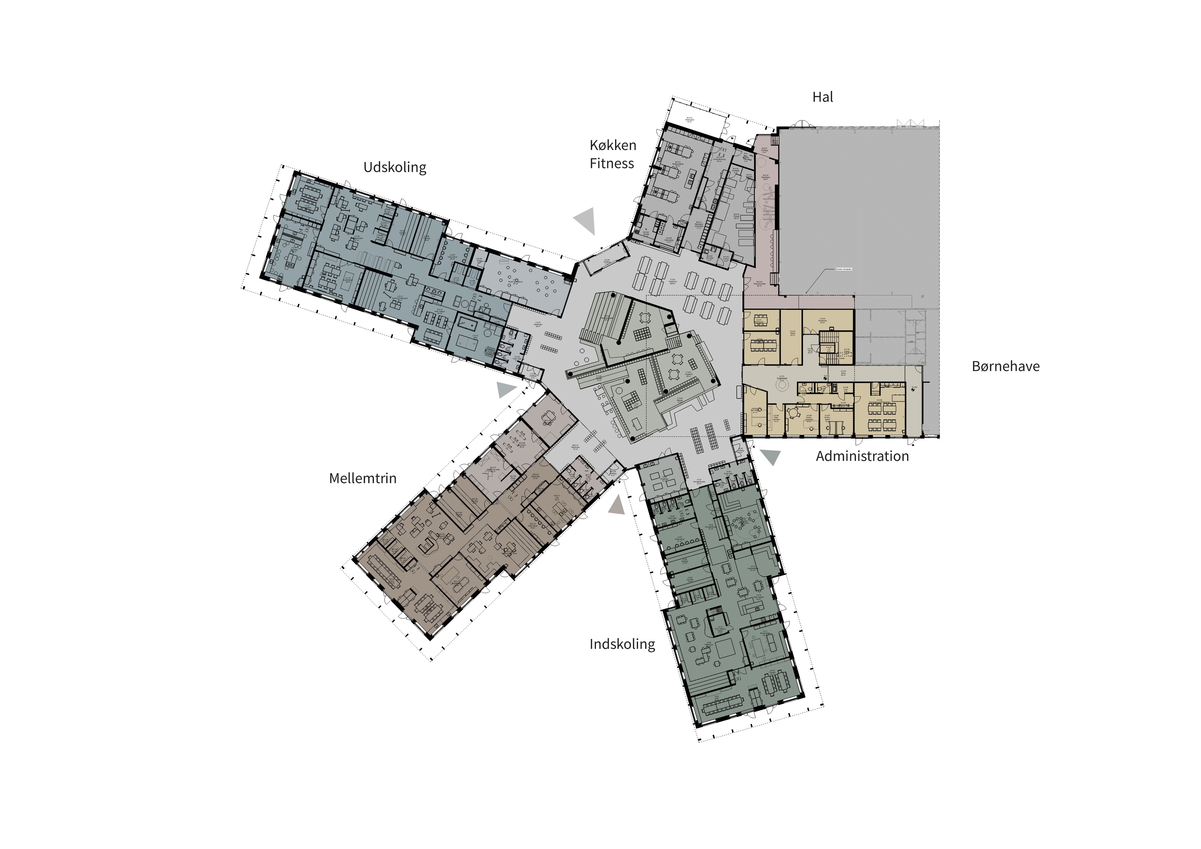I stedet for traditionelle klasseværelser vil der i tre af armene være fælleslokaler, fordybelsesrum og værkstedsfaciliteter, der også kan benyttes af byens foreninger. På den måde opstår et nyt samlingspunkt for byens borgere.