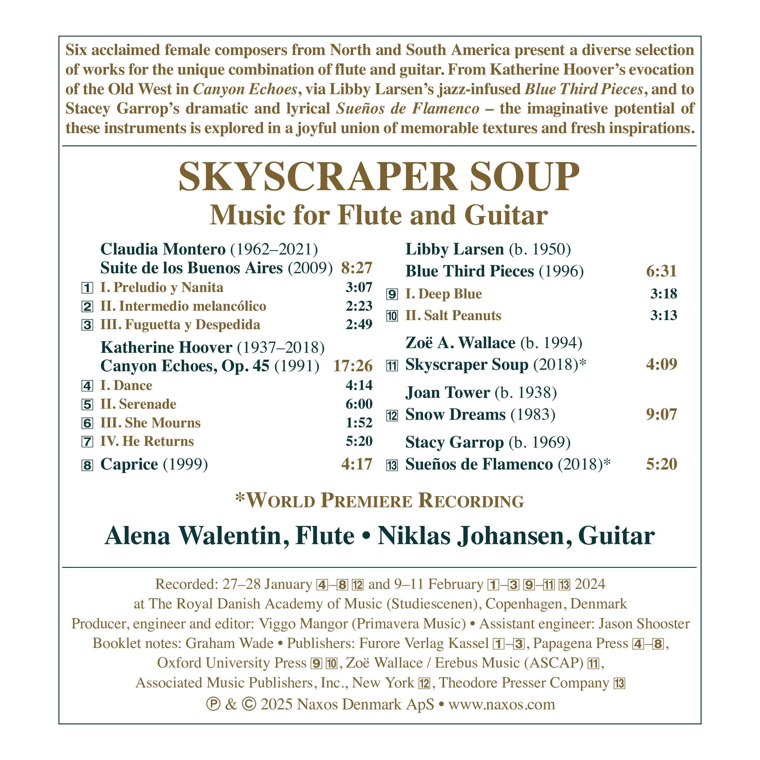 Med Katherine Hoovers tidsrejse til det gamle Vesten i Canyon Echoes, Libby Larsens jazz-inspirerede Blue Third Pieces, og Stacey Garrops dramatiske og lyriske Sueños de Flamenco er Skyscraper Soup et album, der som et højhus i en storby, åbner vinduer til meget forskellige anskuelser for, hvordan fløjte og guitar kan udtrykke sig sammen.